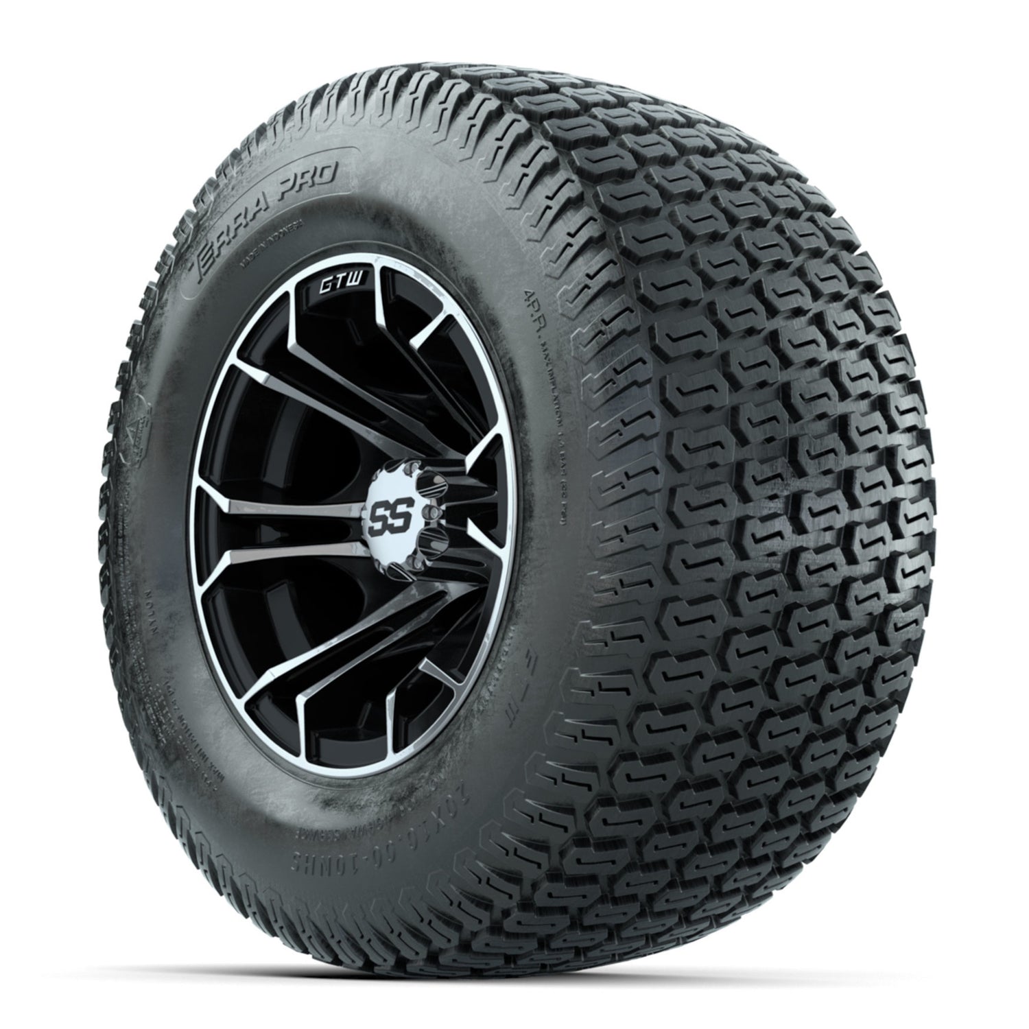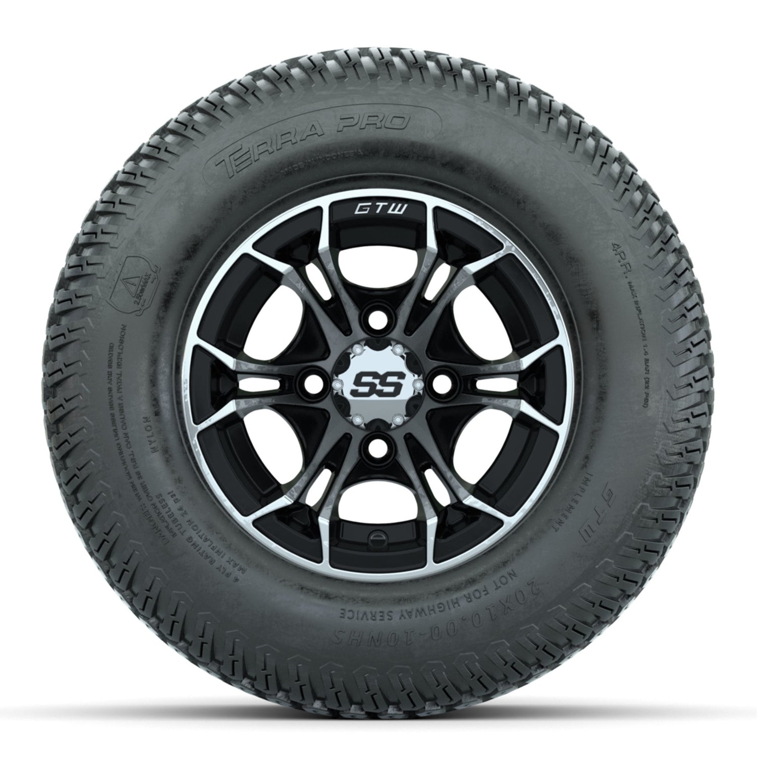 A set of (4) 10-inch GTW® Spyder Machined/Black golf cart wheels Mounted on 20x10-10 Terra Pro S-Tread Traction Tires