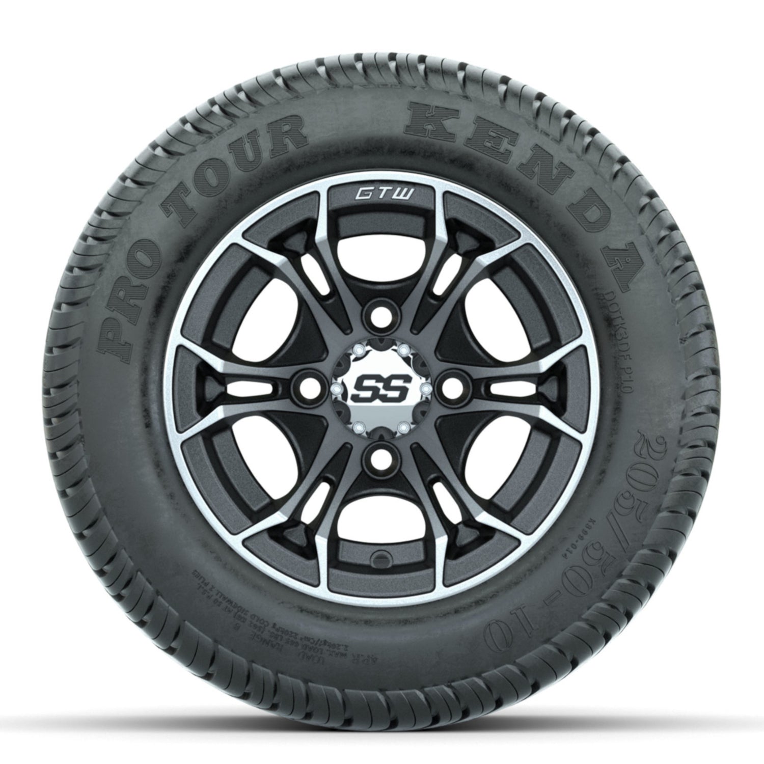 A set of (4) 10-inch GTW® Spyder Machined/Matte Grey golf cart wheels Mounted on 205/50-10 Kenda Pro Tour Low-profile Tires