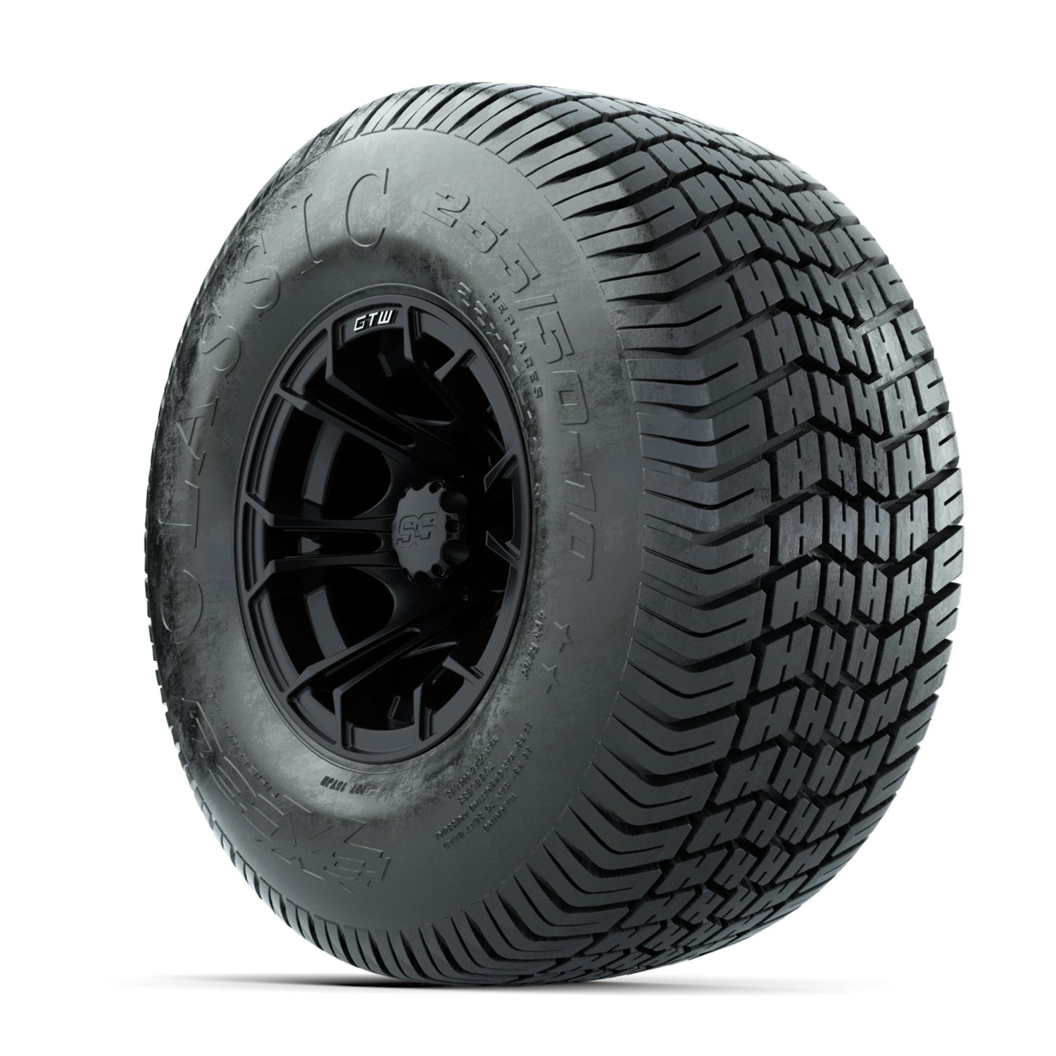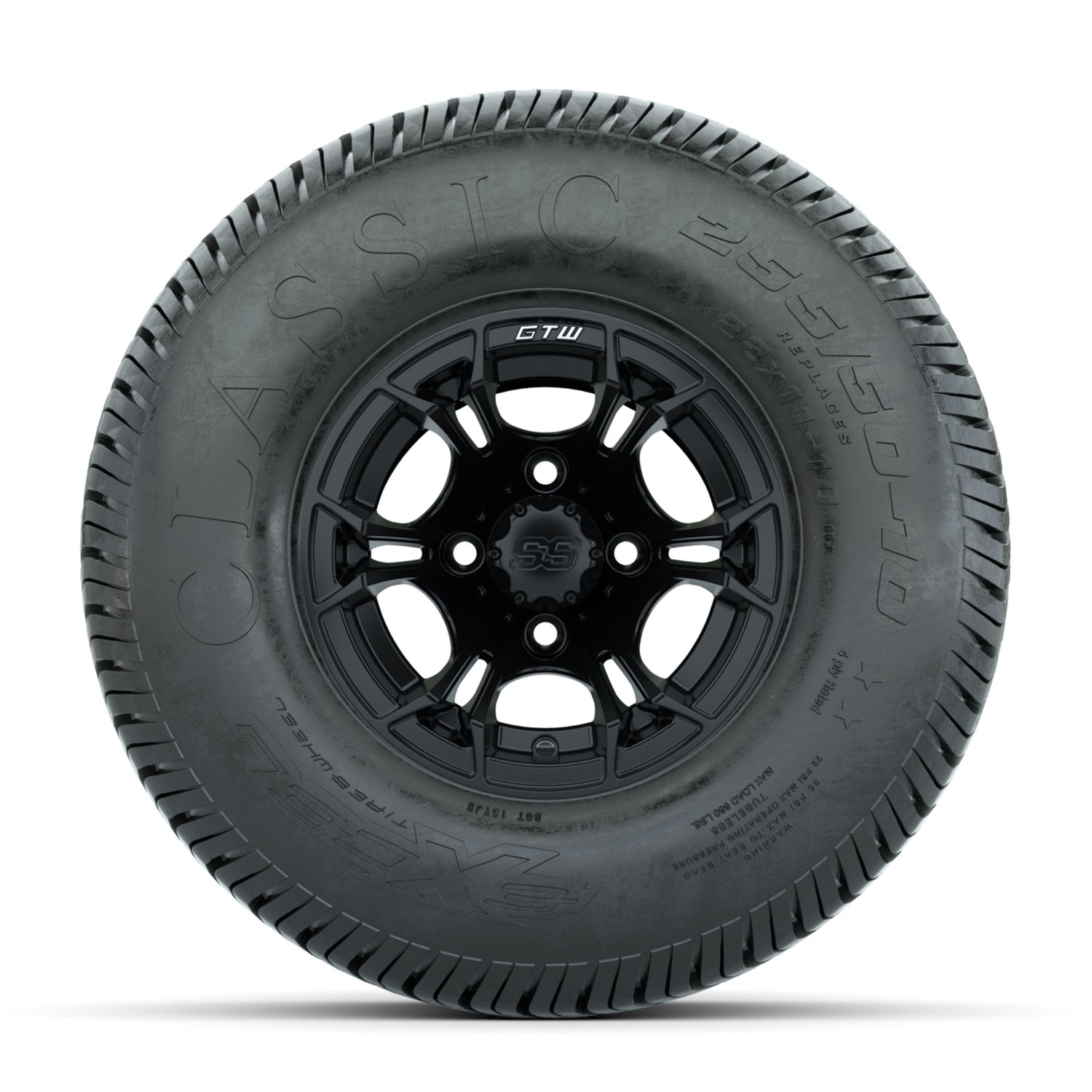 A set of (4) 10-inch GTW® Spyder Matte Black golf cart wheels Mounted on 22x11-10 Excel Classic Street Tires