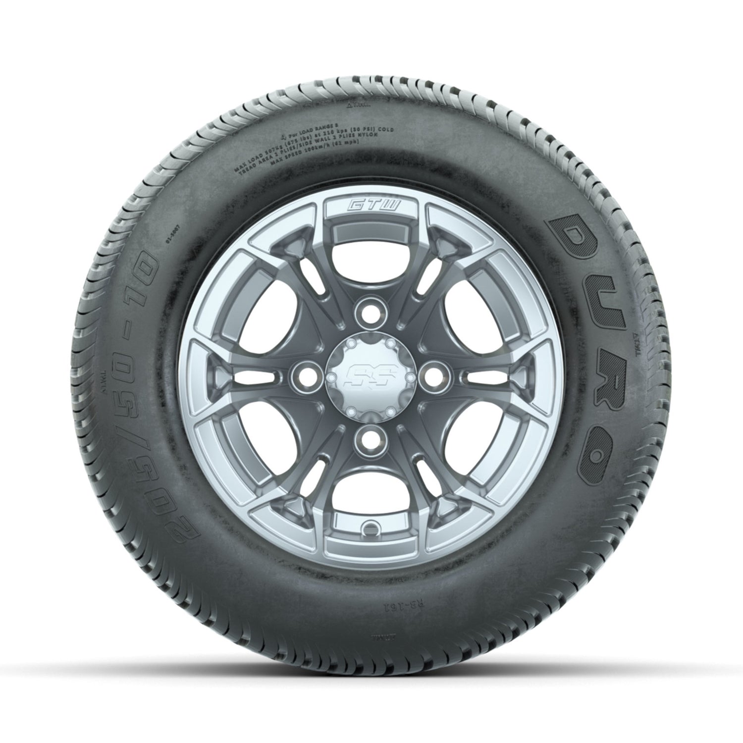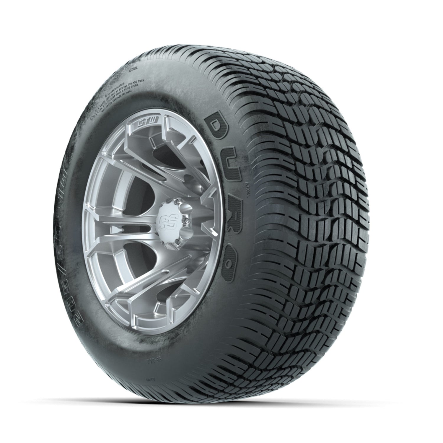 A set of (4) 10-inch GTW® Spyder Silver Brush golf cart wheels Mounted on 205/50-10 Duro Low-profile Tires