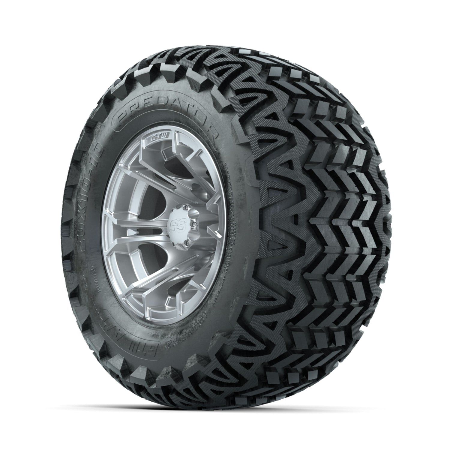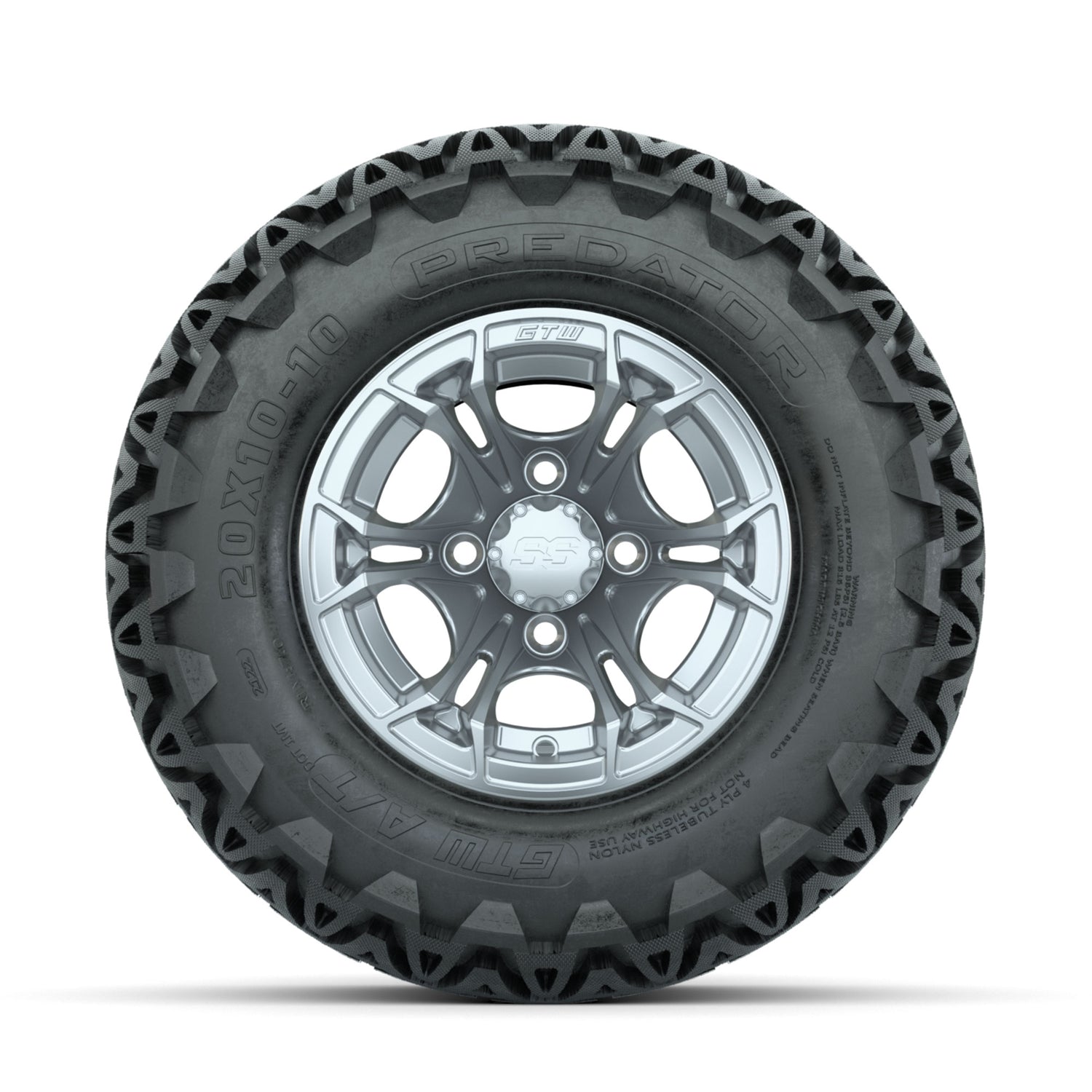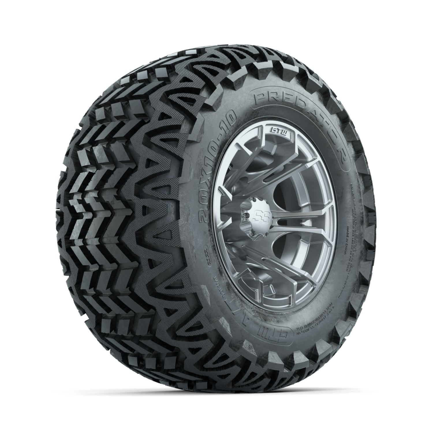 A set of (4) 10-inch GTW® Spyder Silver Brush golf cart wheels Mounted on 20x10-10 Predator All-Terrain Tires