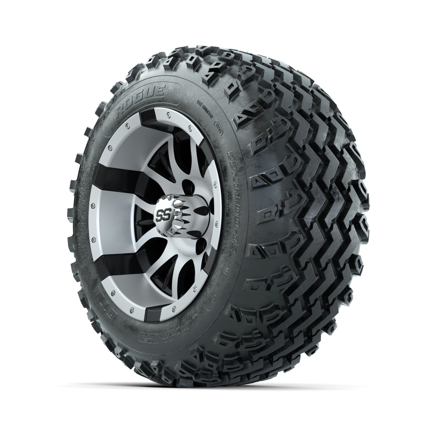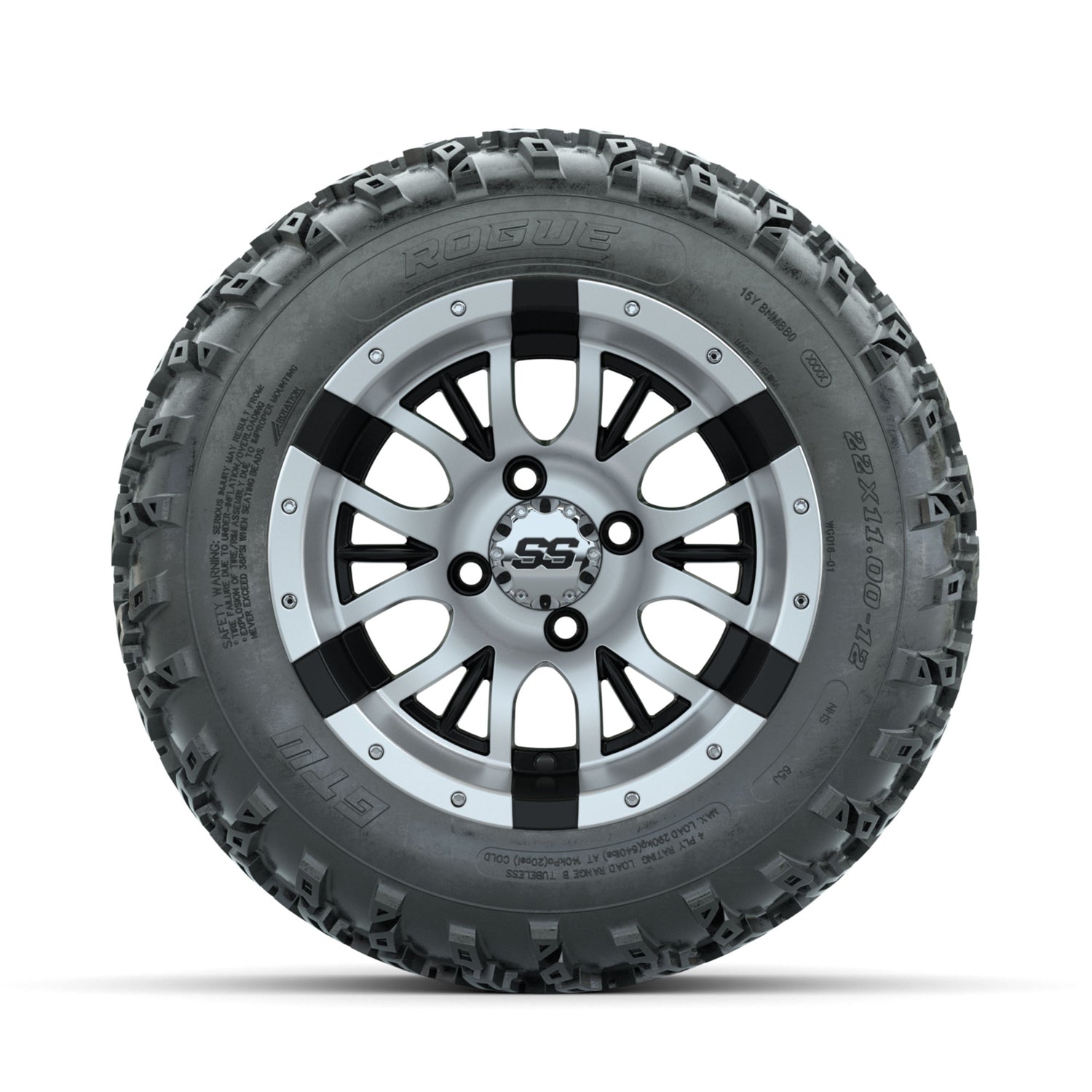 A set of (4) 12-inch GTW® Diesel Machined/Black golf cart wheels Mounted on 22x11.00-12 Rogue All-Terrain Tires