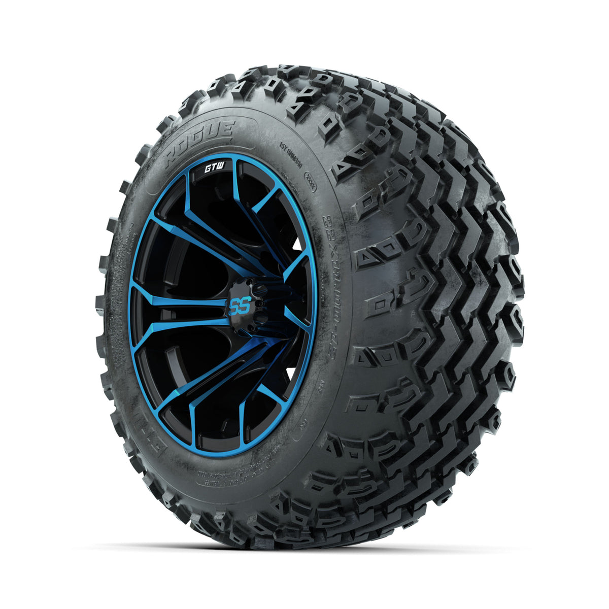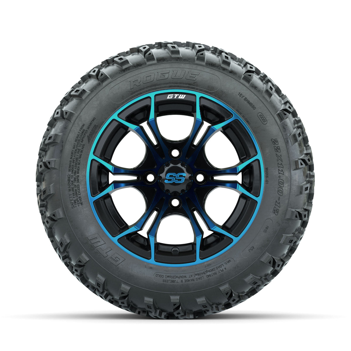 A set of (4) 12-inch GTW® Spyder Blue/Black golf cart wheels Mounted on 22x11.00-12 Rogue All-Terrain Tires