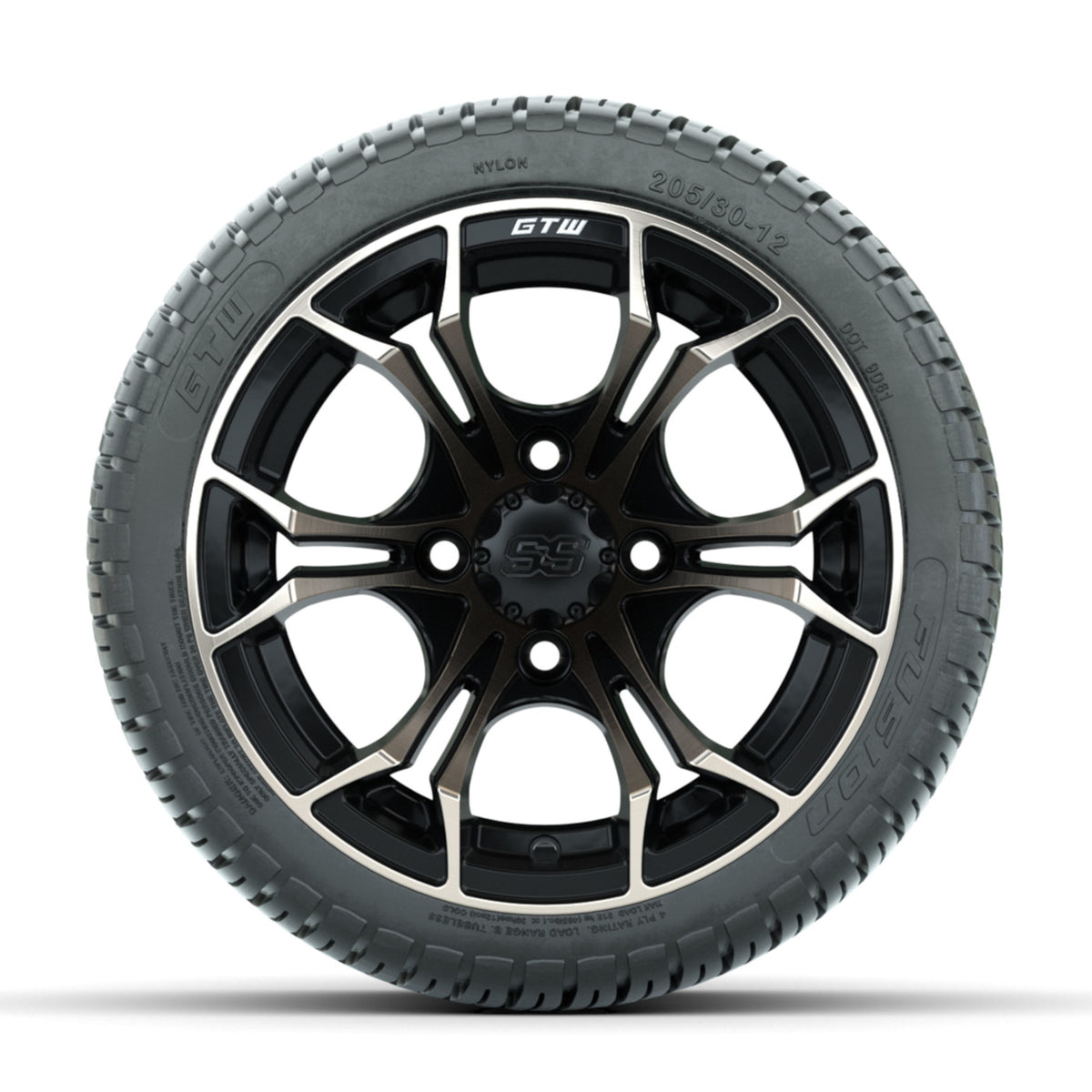 A set of (4) 12-inch GTW® Spyder Bronze/Matte Black golf cart wheels Mounted on 205/30-12 GTW® Fusion Street Tires