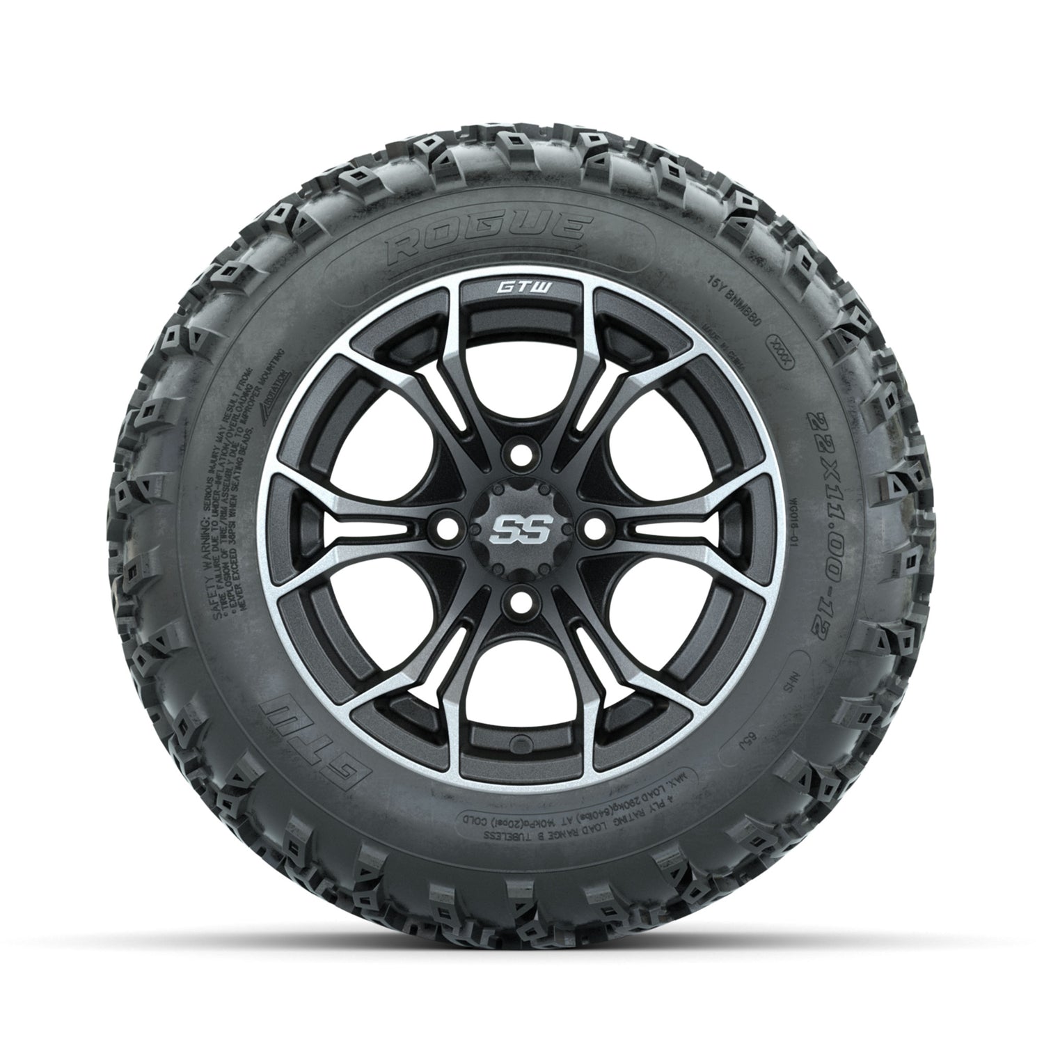 A set of (4) 12-inch GTW® Spyder Machined/Grey golf cart wheels Mounted on 22x11.00-12 Rogue All-Terrain Tires