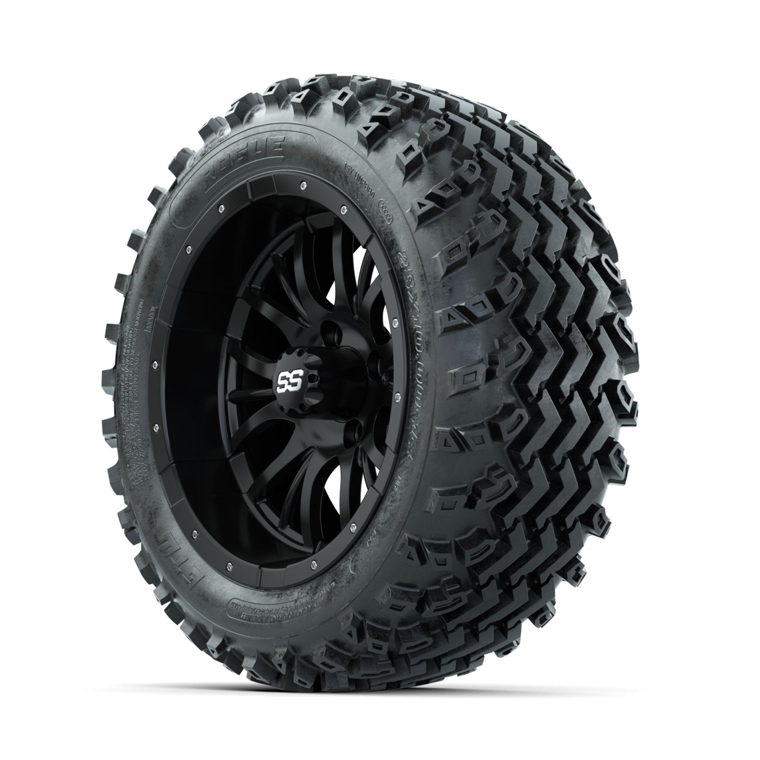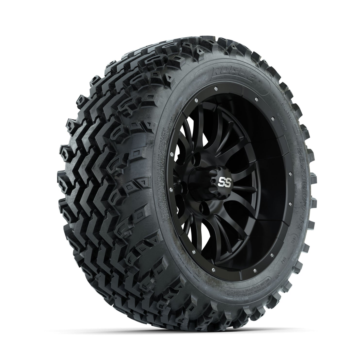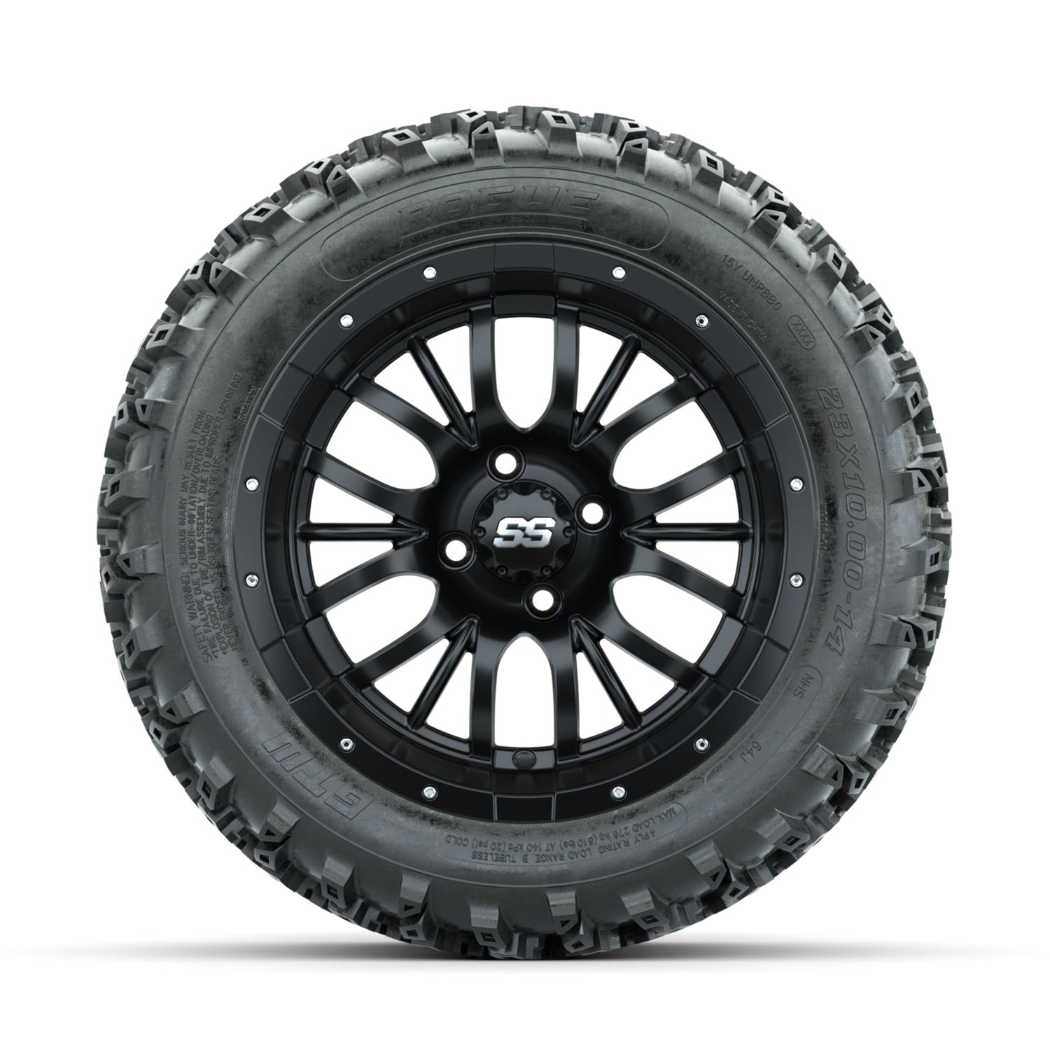 A set of (4) 14-inch GTW® Diesel Matte Black golf cart wheels Mounted on 23x10.00-14 Rogue All-Terrain Tires
