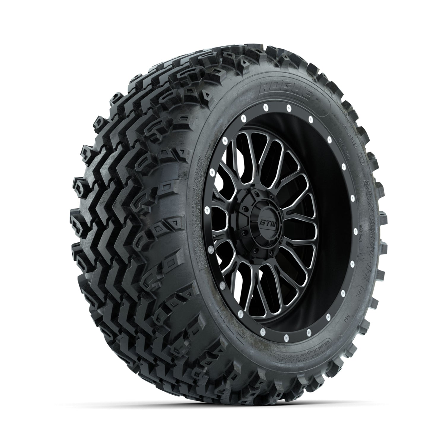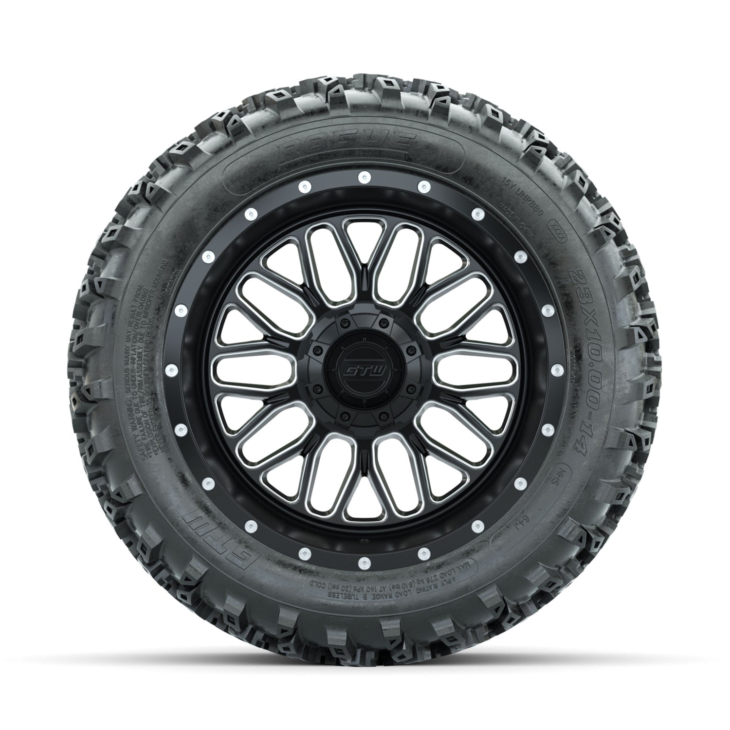 A set of (4) 14-inch GTW® Helix Machined/Black golf cart wheels Mounted on 23x10.00-14 Rogue All-Terrain Tires