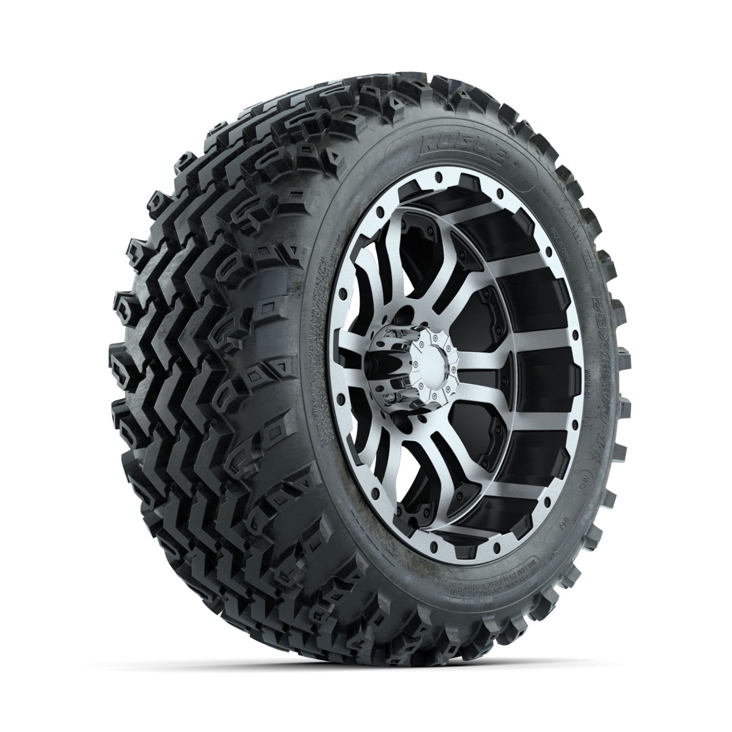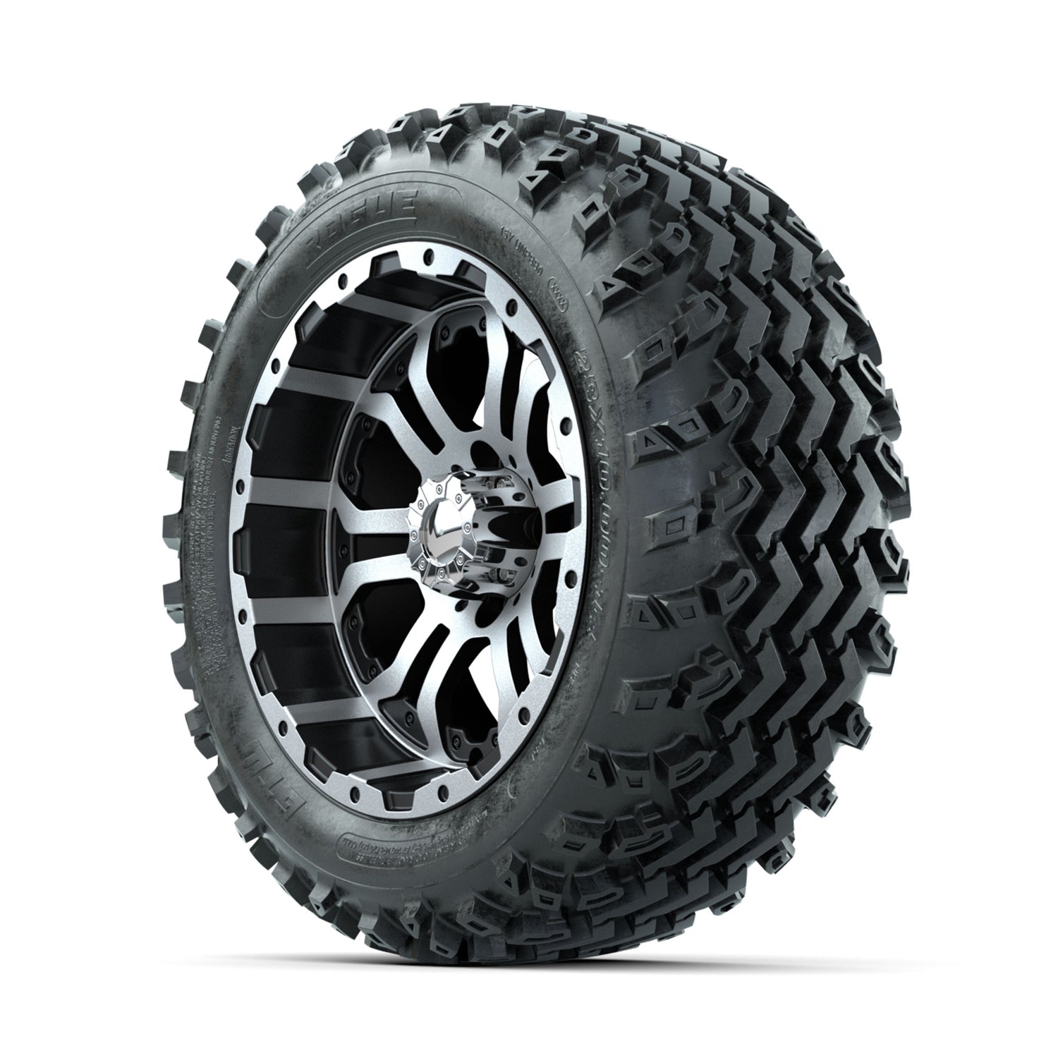 A set of (4) 14-inch GTW® Omega Machined/Black golf cart wheels Mounted on 23x10.00-14 Rogue All-Terrain Tires
