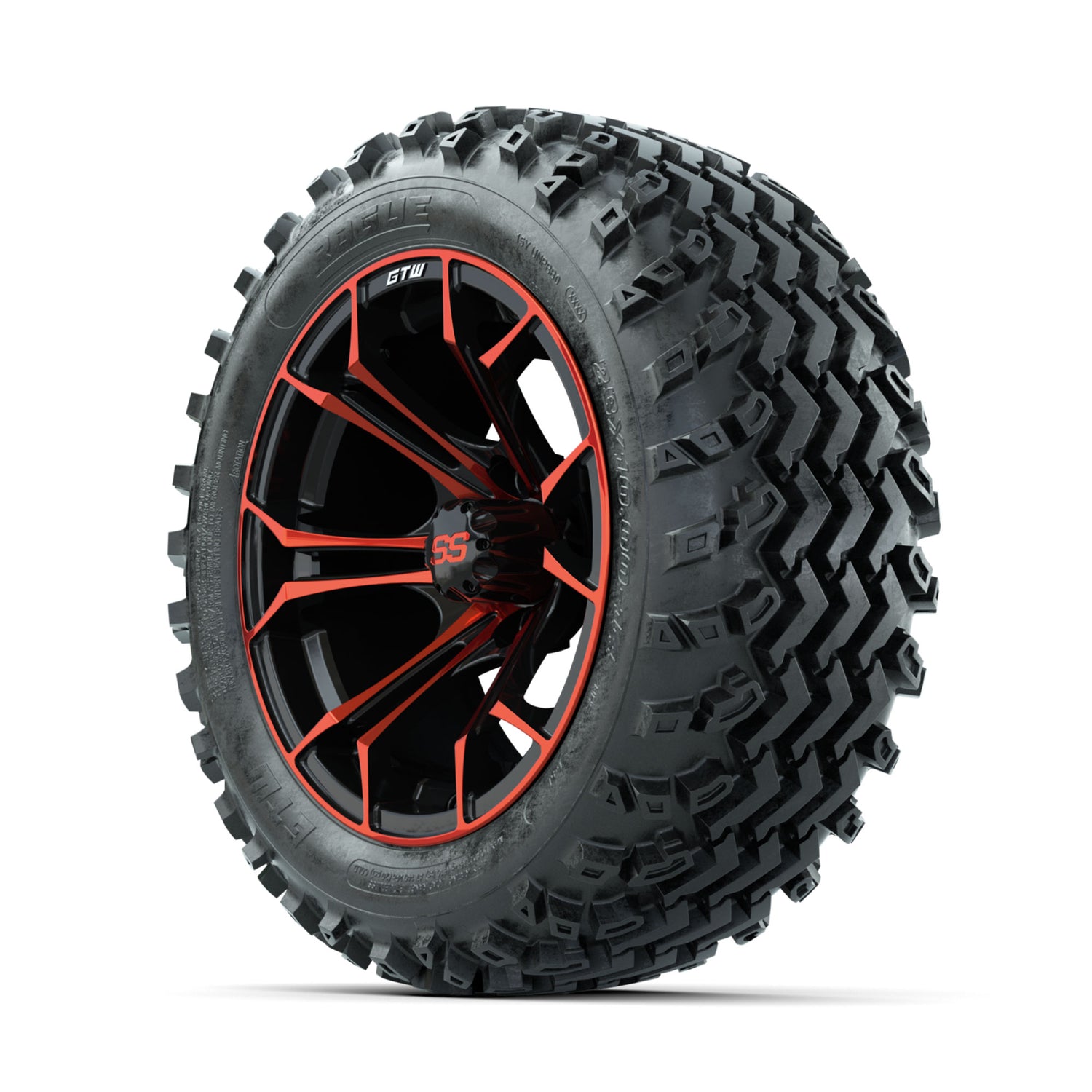 A set of (4) 14-inch GTW® Spyder Red/Black golf cart wheels Mounted on 23x10.00-14 Rogue All-Terrain Tires
