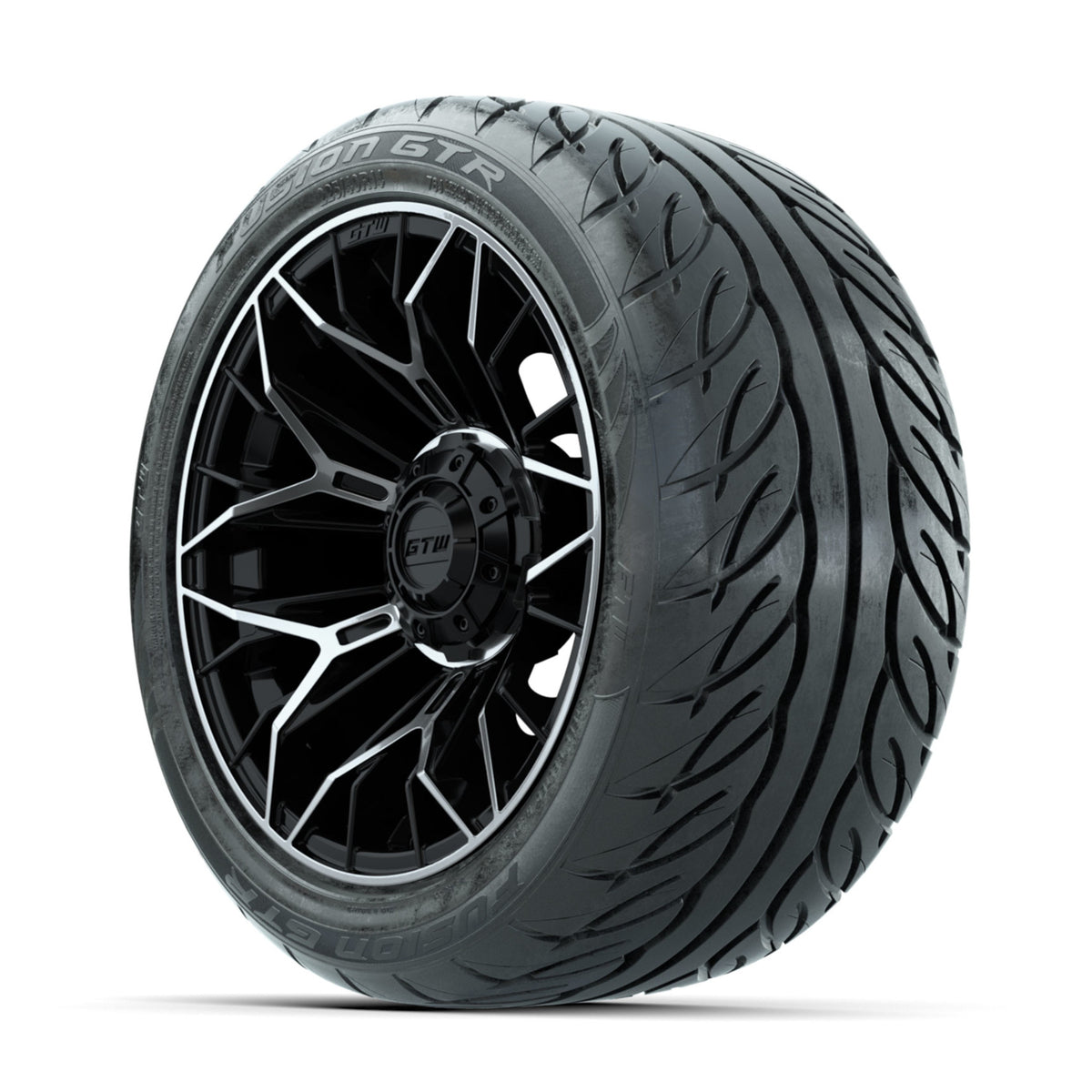 A set of (4) 14-inch GTW® Stellar Machined/Black golf cart wheels Mounted on 225/40-R14 GTW® Fusion GTR Steel Belted Street Tires