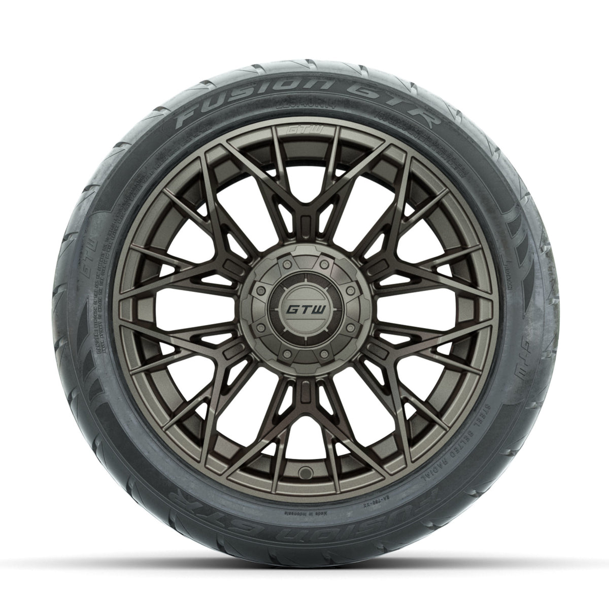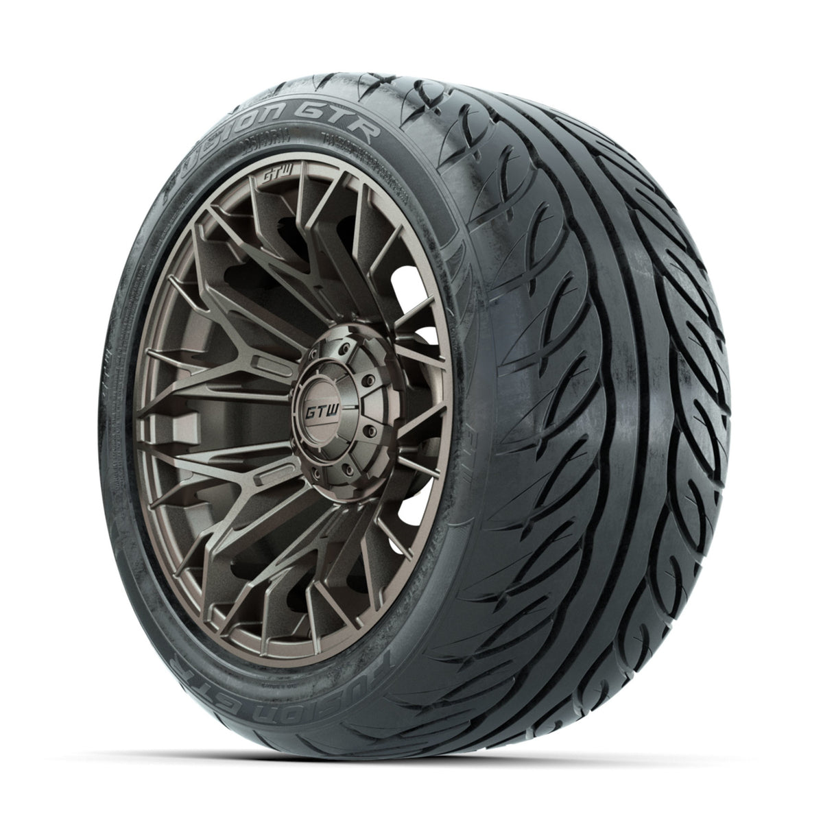 A set of (4) 14-inch GTW® Stellar Matte Bronze golf cart wheels Mounted on 225/40-R14 GTW® Fusion GTR Steel Belted Street Tires