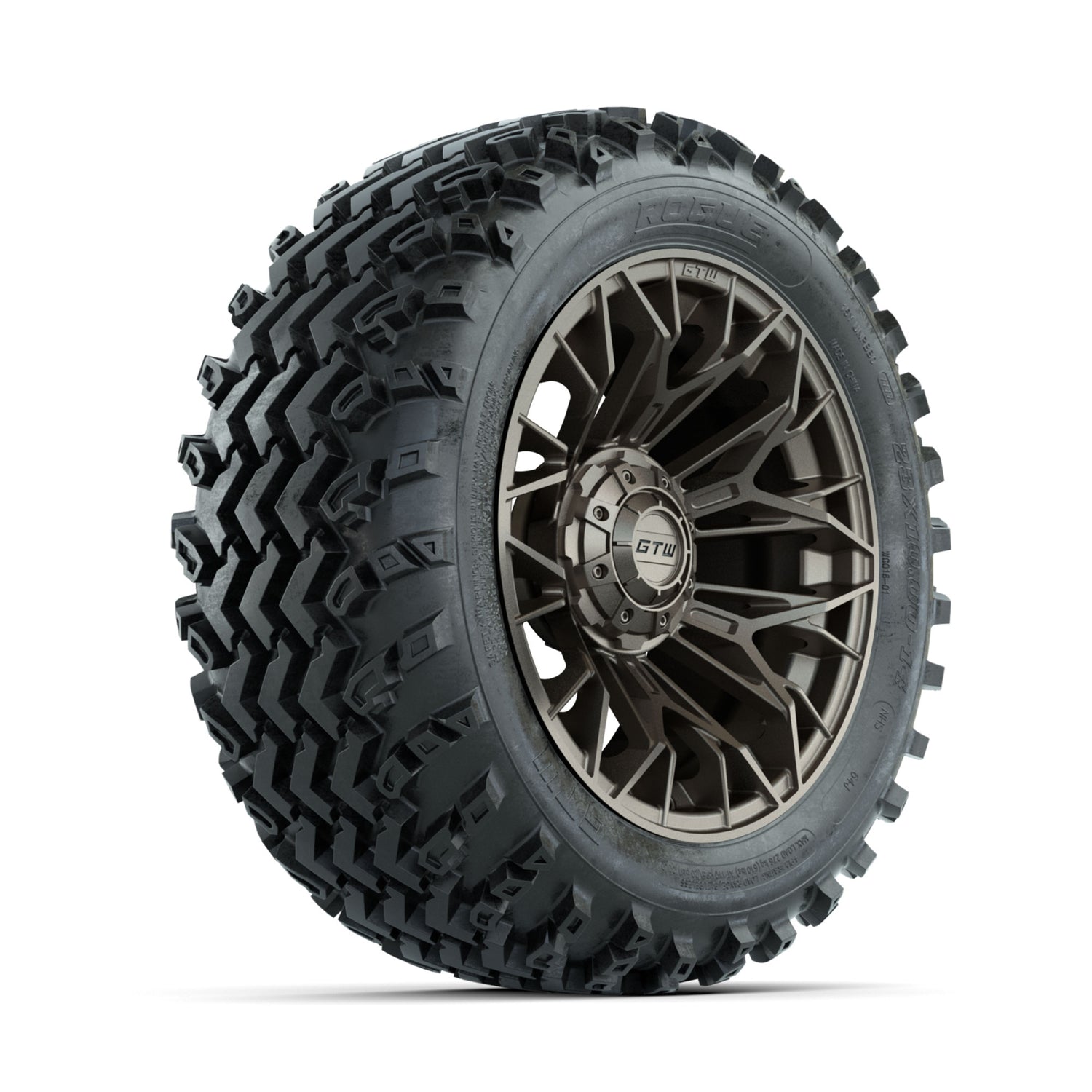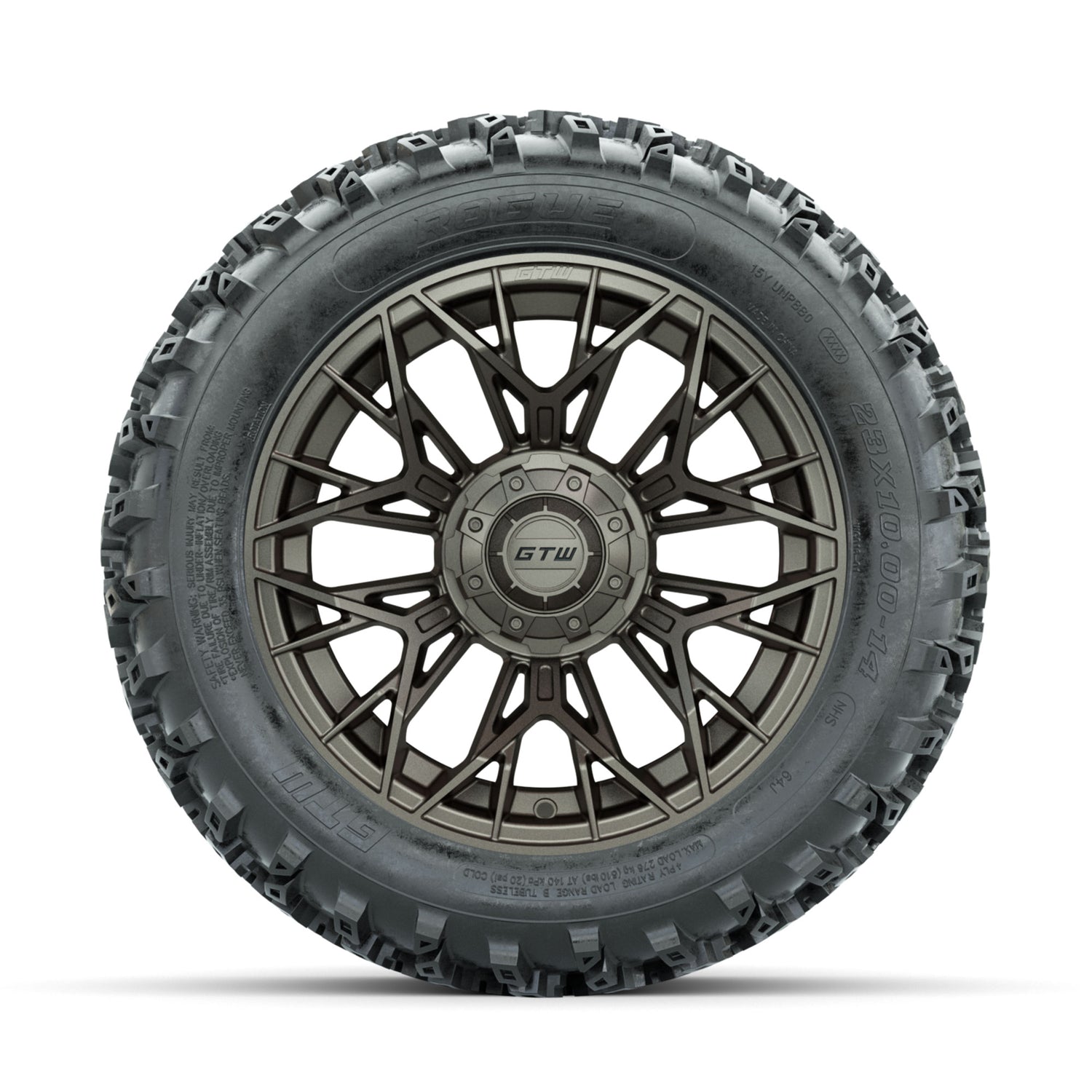 A set of (4) 14-inch GTW® Stellar Matte Bronze golf cart wheels Mounted on 23x10.00-14 Rogue All-Terrain Tires