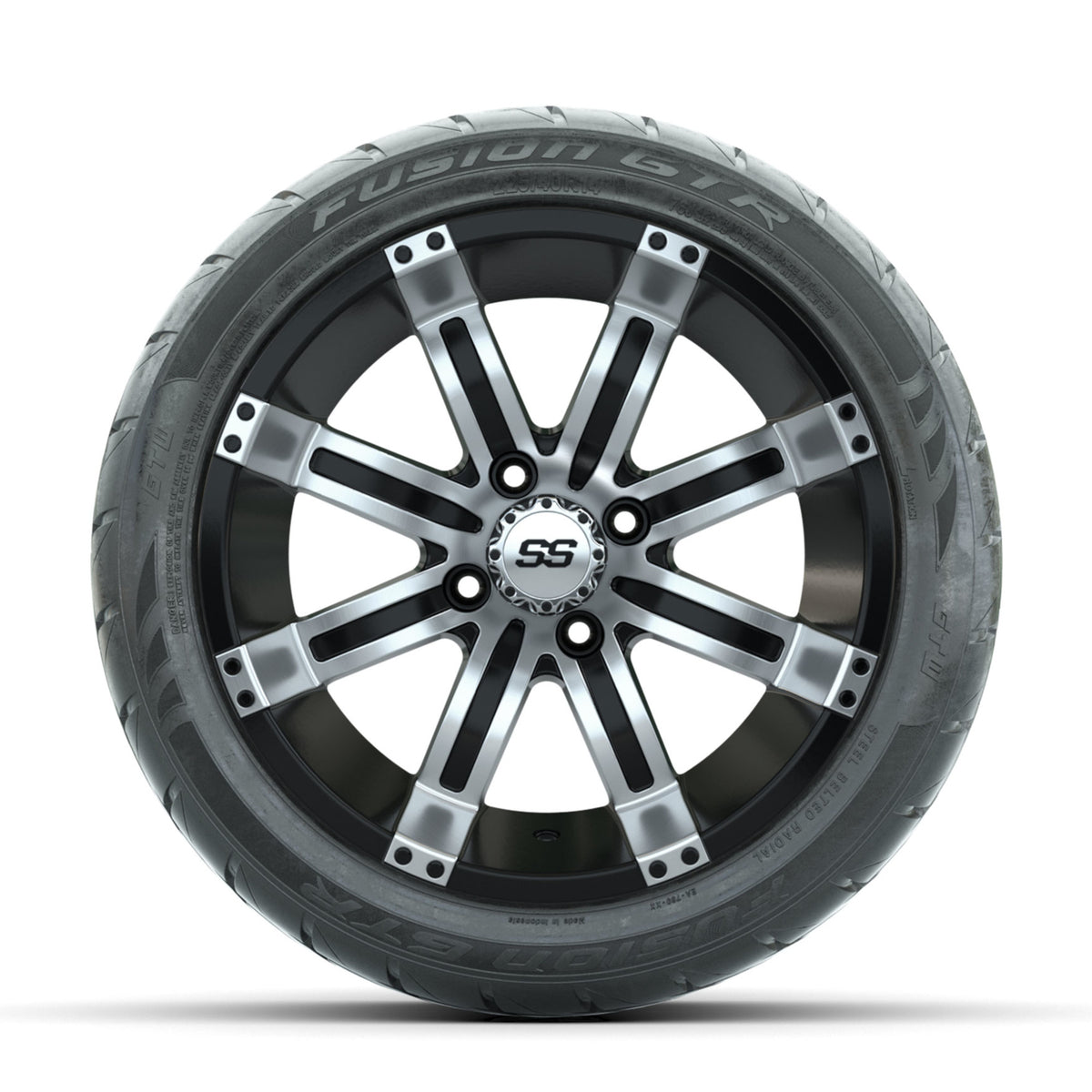 A set of (4) 14-inch GTW® Tempest Machined/Black golf cart wheels Mounted on 225/40-R14 GTW® Fusion GTR Steel Belted Street Tires