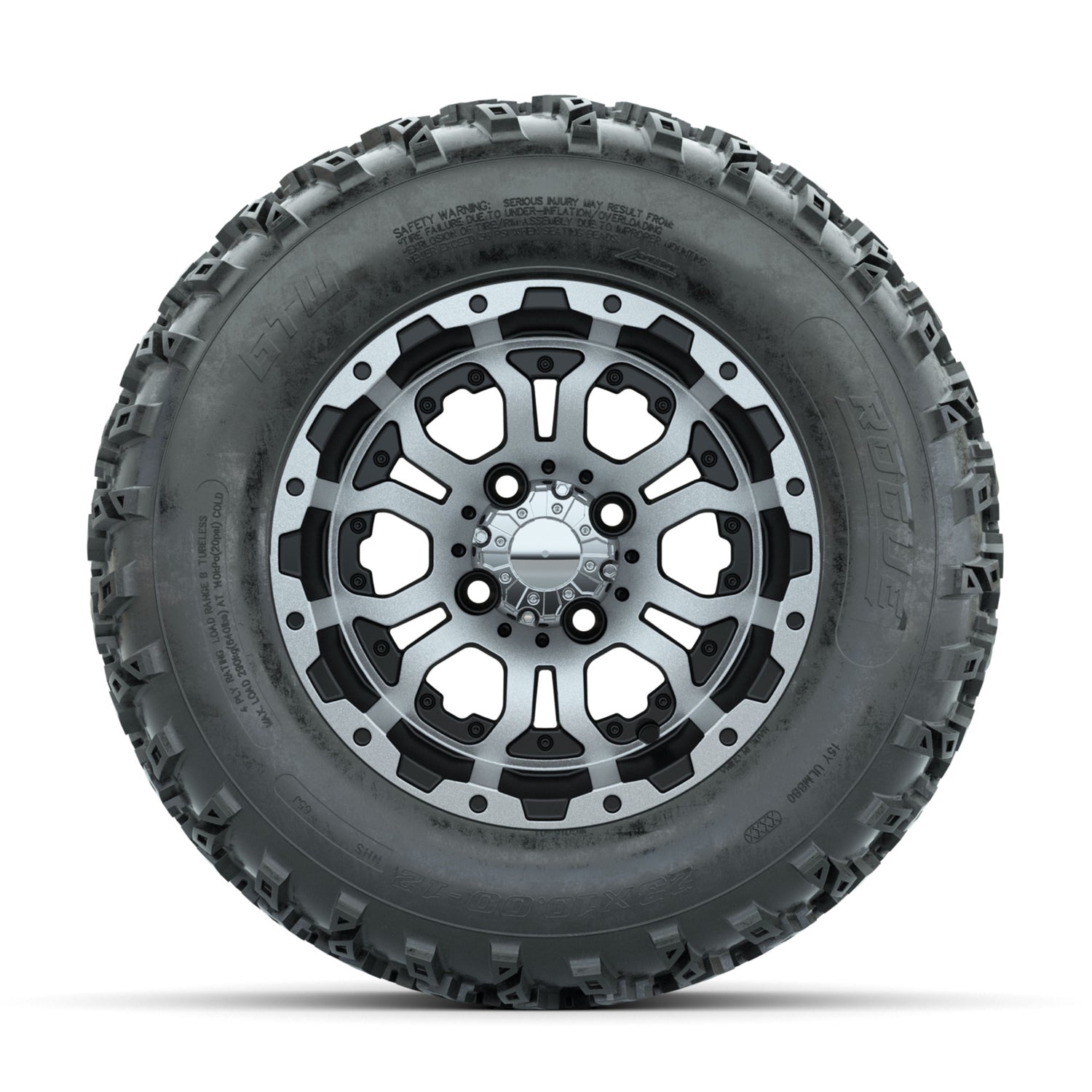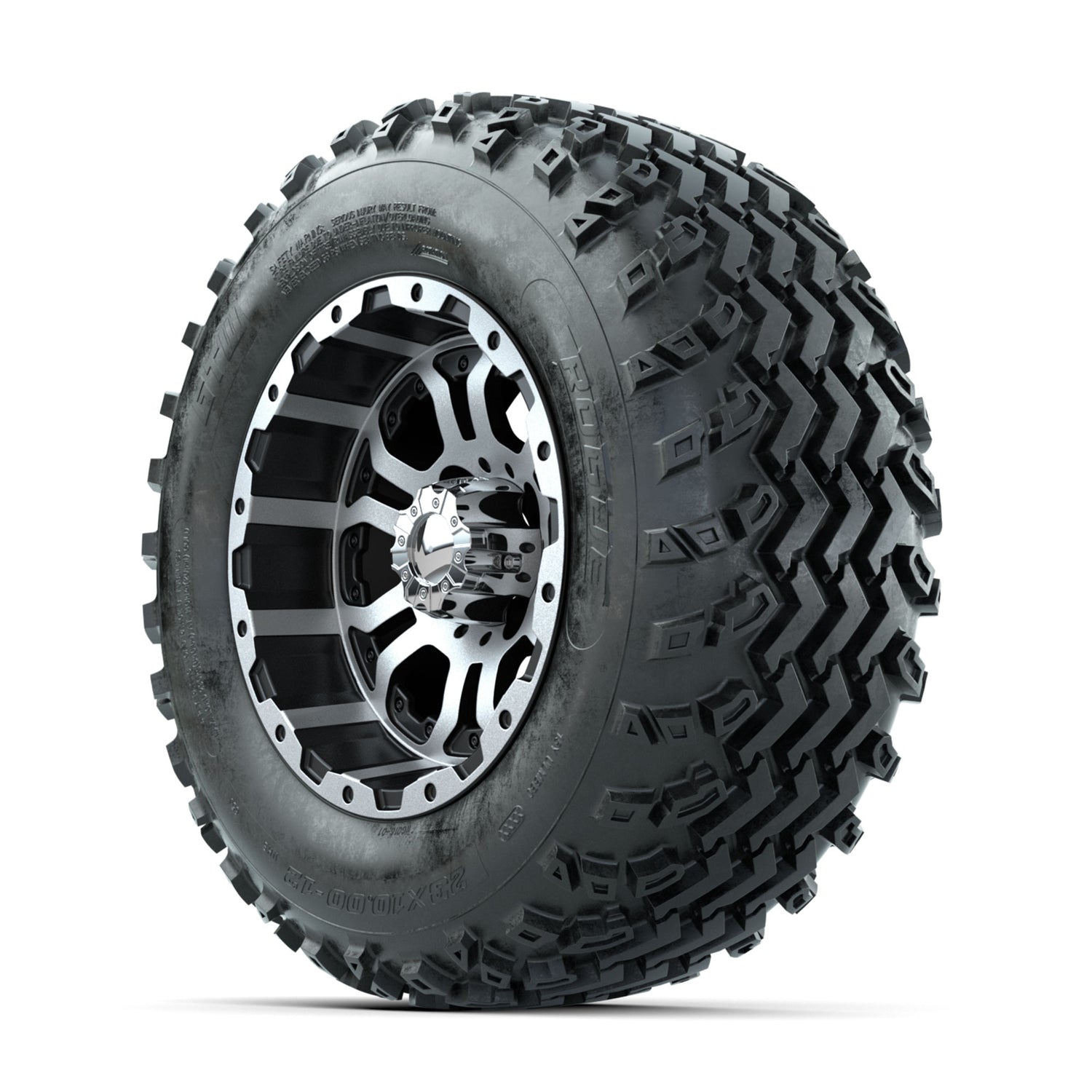 A set of (4) 12-inch GTW® Omega Machined/Black golf cart wheels Mounted on 23x10.00-12 Rogue All-Terrain Tires