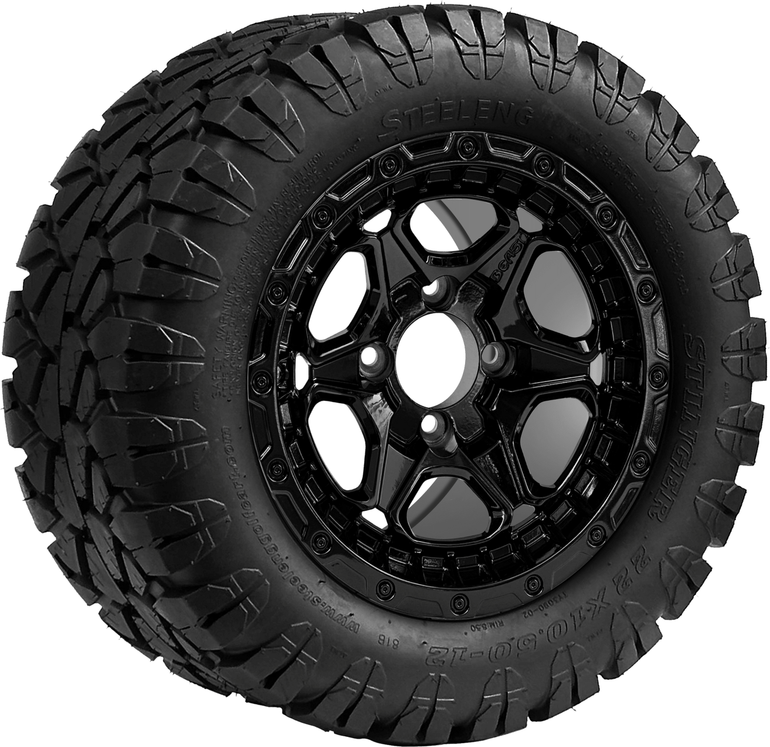 SGC 12 " Mantis Glossy Black Wheel - Aluminum Alloy / STEELENG 22 "x10.5 "-12 " STINGER All Terrain Tire DOT approved Tires Combo - Set of 4