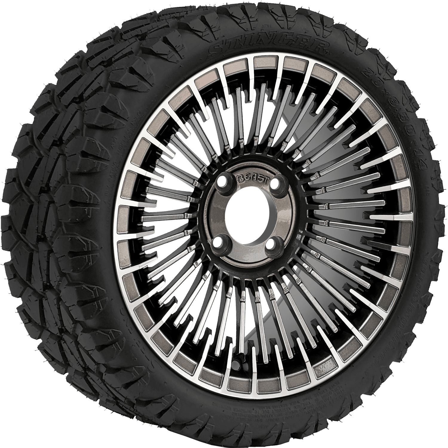 SGC 14 " Piranha Machined Gunmetal Wheel - Aluminum Alloy / STEELENG 20 "x8.5 "-14 " STINGER AT Tire DOT Approved Tires Combo - Set of 4