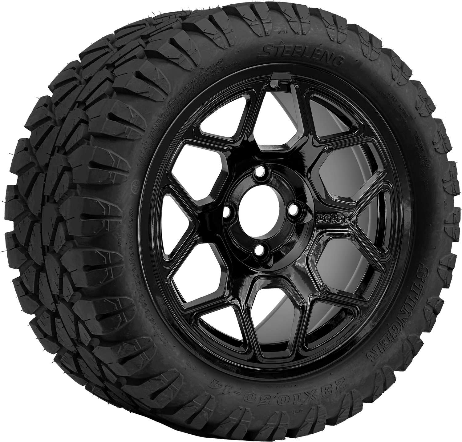 SGC 14 " Yeti Glossy Black Wheel - Aluminum Alloy / STEELENG 23 "x10.5 "-14 " STINGER AT Tire DOT Approved Tires Combo - Set of 4