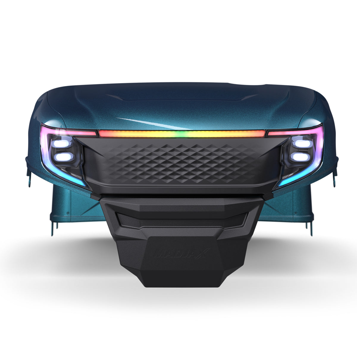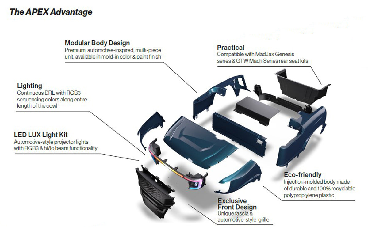 Engineered to seamlessly integrate with the E-Z-GO RXV, the Apex is designed to exceed standards and break the mold. Staying true to the innovative MadJax spirit, the Apex body stands out with its rugged styling, cutting-edge technology, and modular set up. Top-tier lighting is integrated into the design as vibrant, sequencing colors travel along the cowl.