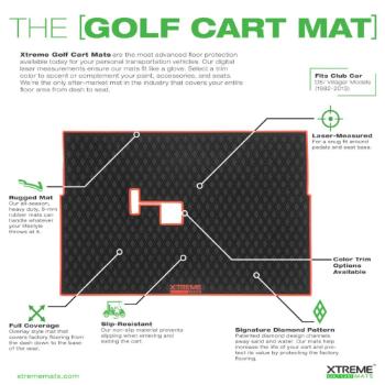 Xtreme Mats has created a FULL COVERAGE golf cart floor mat that is laser-measured to fit as if it came directly from the manufacturer. Our heavy-duty, 8-mm rubber golf cart floor mat remains securely in place even during rugged terrain navigation. Our mats produce no VOCs so you won't have to worry about it stinking up your garage either! Our patented design picks up where the other guys left off. Unlike other golf cart floor mats that offer only partial coverage, Xtreme Mats won't limit where riders can place their feet and you won't end up with a pile of dirt behind your floor mat. Xtreme Mats Golf Cart Floor Mat covers your entire OEM flooring from the bottom of the dash down to the base of the seat. No longer worry about mud, water, or dirt damaging your cart's flooring! Xtreme Golf Cart Mats are available in a variety of colors to complement almost any aesthetic.