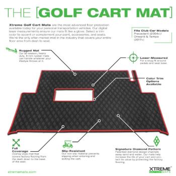 Xtreme Mats has created a FULL COVERAGE golf cart floor mat that is laser-measured to fit as if it came directly from the manufacturer. Our heavy-duty, 8-mm rubber golf cart floor mat remains securely in place even during rugged terrain navigation. Our mats produce no VOCs so you won't have to worry about it stinking up your garage either! Our patented design picks up where the other guys left off. Unlike other golf cart floor mats that offer only partial coverage, Xtreme Mats won't limit where riders can place their feet and you won't end up with a pile of dirt behind your floor mat. Xtreme Mats Golf Cart Floor Mat covers your entire OEM flooring from the bottom of the dash down to the base of the seat. No longer worry about mud, water, or dirt damaging your cart's flooring! Xtreme Golf Cart Mats are available in a variety of colors to complement almost any aesthetic.
