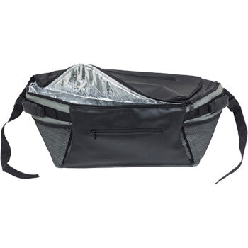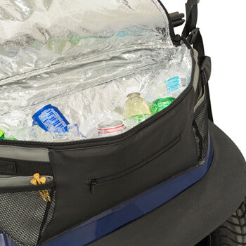 A golf cart mountable cooler for the front cowl from Nivel Parts can hold 18 twelve-ounce cans or 12 one-quart bottles. We design it to maintain cold temperatures with ice cubes, ice trays, or cooler packs. A hidden drain plug for easy drainage and storing makes this an easy choice. We like to use the top storage pocket for sandwiches or snacks, but you can put anything up there that will fit. Its location gives it versatility in use and does not limit your mobility. The only catch is the cart must have roof supports and a top to install this handy little aftermarket part.
