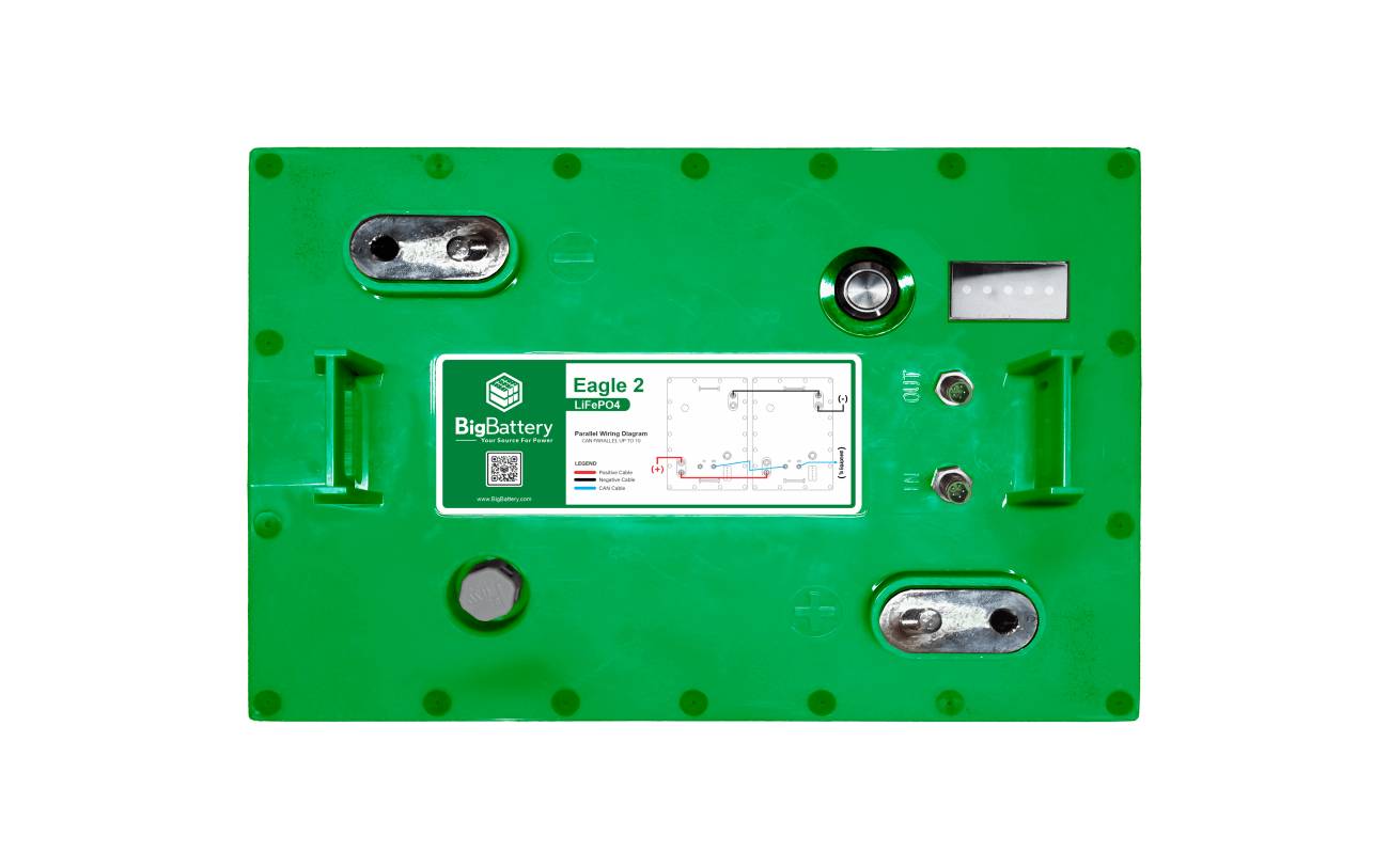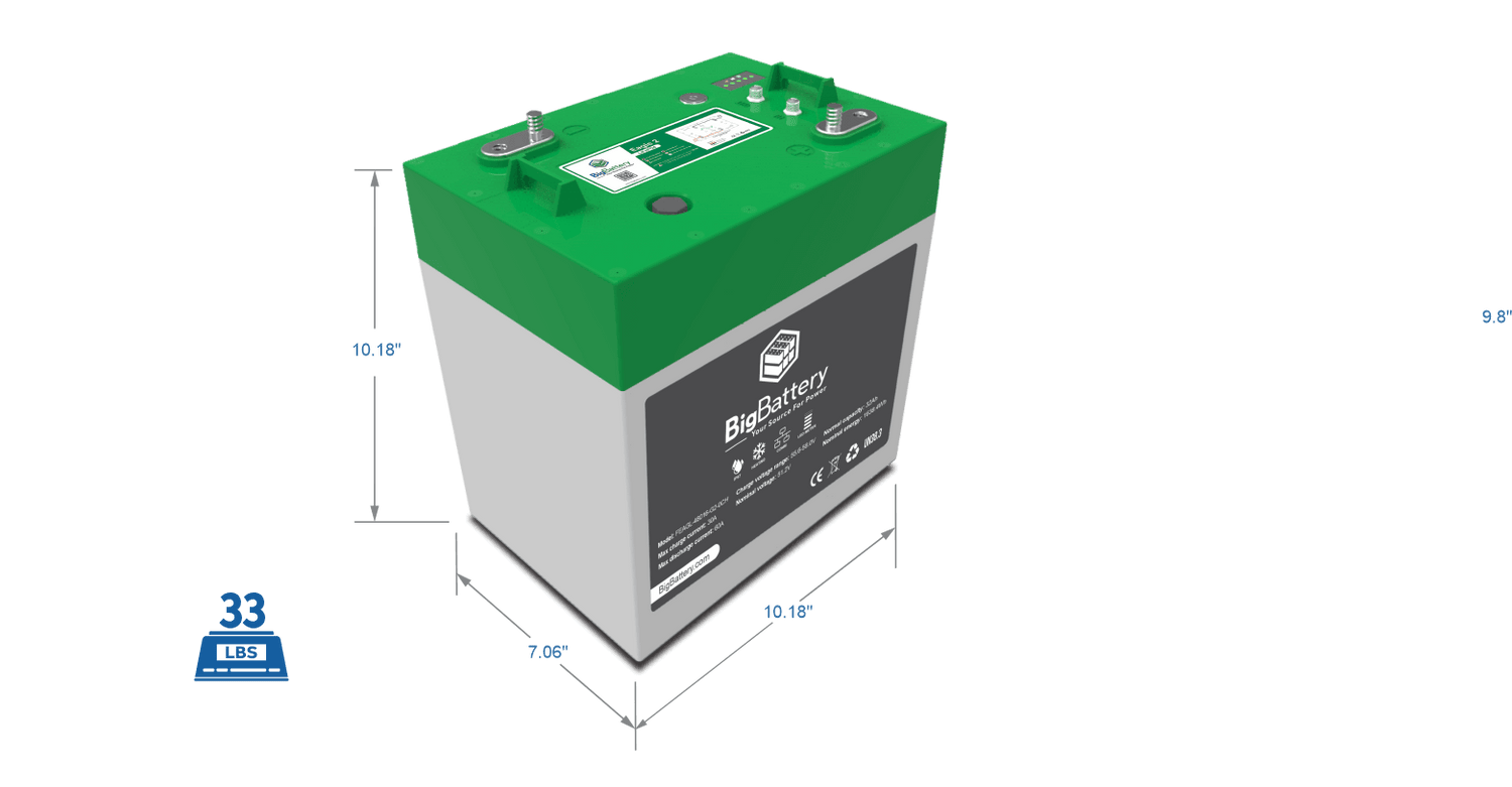 2ND GENERATION POWER TAKES FLIGHT! Introducing BigBattery’s all-new 48V 1.63 kWh LiFePO4 EAGLE 2. This battery embodies the reliability and durability you’ve come to expect from BigBattery solutions, packing Tier 1 LFP cells in a compact, GC2 form factor. This energy-dense design allows for effortless installations in your golf cart, utility vehicle, RV, or camper van, and the EAGLE 2 serves as a mirror-image replacement for any stock T-105 lead-acid battery.