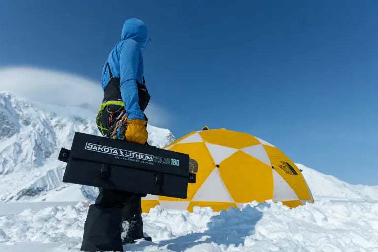 Built for rugged packability and high performance in extreme cold, this 180 watt solar panel is the optimal size for large power stations and solar generators and will charge any 12V Dakota Lithium battery. In full sun it will charge a Powerbox+ 60 in 7-10 hours, turning it into a solar generator that collects and stores power, allowing you to run many electronics indefinitely. Built in a rugged, military spec nylon case, this solar blanket is waterproof, shatterproof, and half the weight of a glass panel. MC-4 connectors provide universal compatibility. Can be used while power is being drawn from the battery. Designed to hang from a tent, tree, or wall, or lay flat on the ground facing the sun. This panel was first developed by Dakota Lithium for a mountaineering expedition to the Alaska range where it powered basecamp radios, cameras, and electronics during sub zero temperatures. Use multiple panels for a faster charging time or for charging very large solar generators. 11 year warranty.