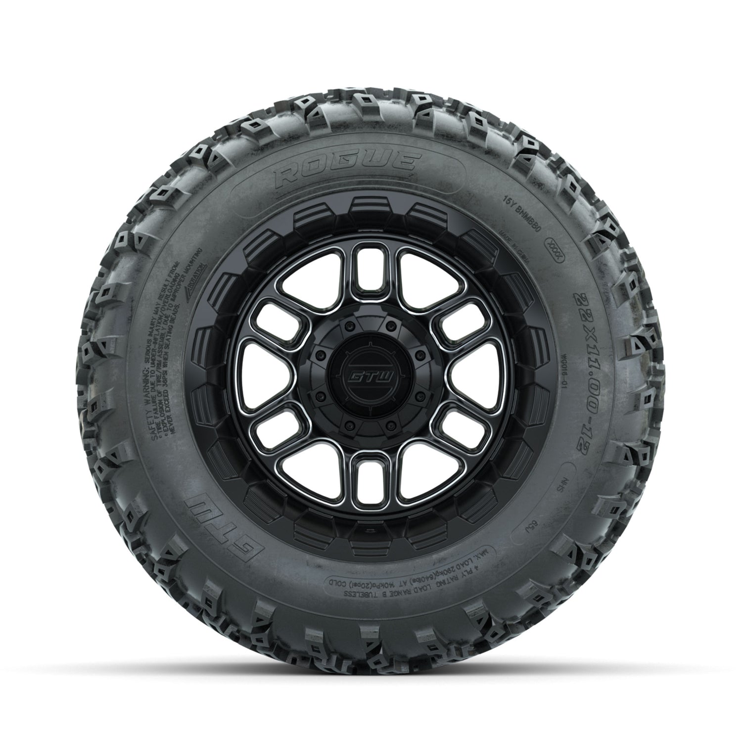A set of (4) 12-inch GTW® Titan Machined/Black golf cart wheels Mounted on 22x11.00-12 Rogue All-Terrain Tires