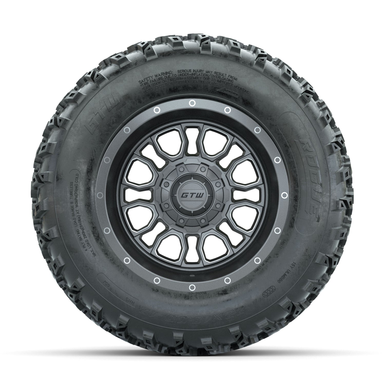 A set of (4) 12-inch GTW® Volt Gunmetal with Machined Accents golf cart wheels Mounted on 23x10.00-12 Rogue All-Terrain Tires