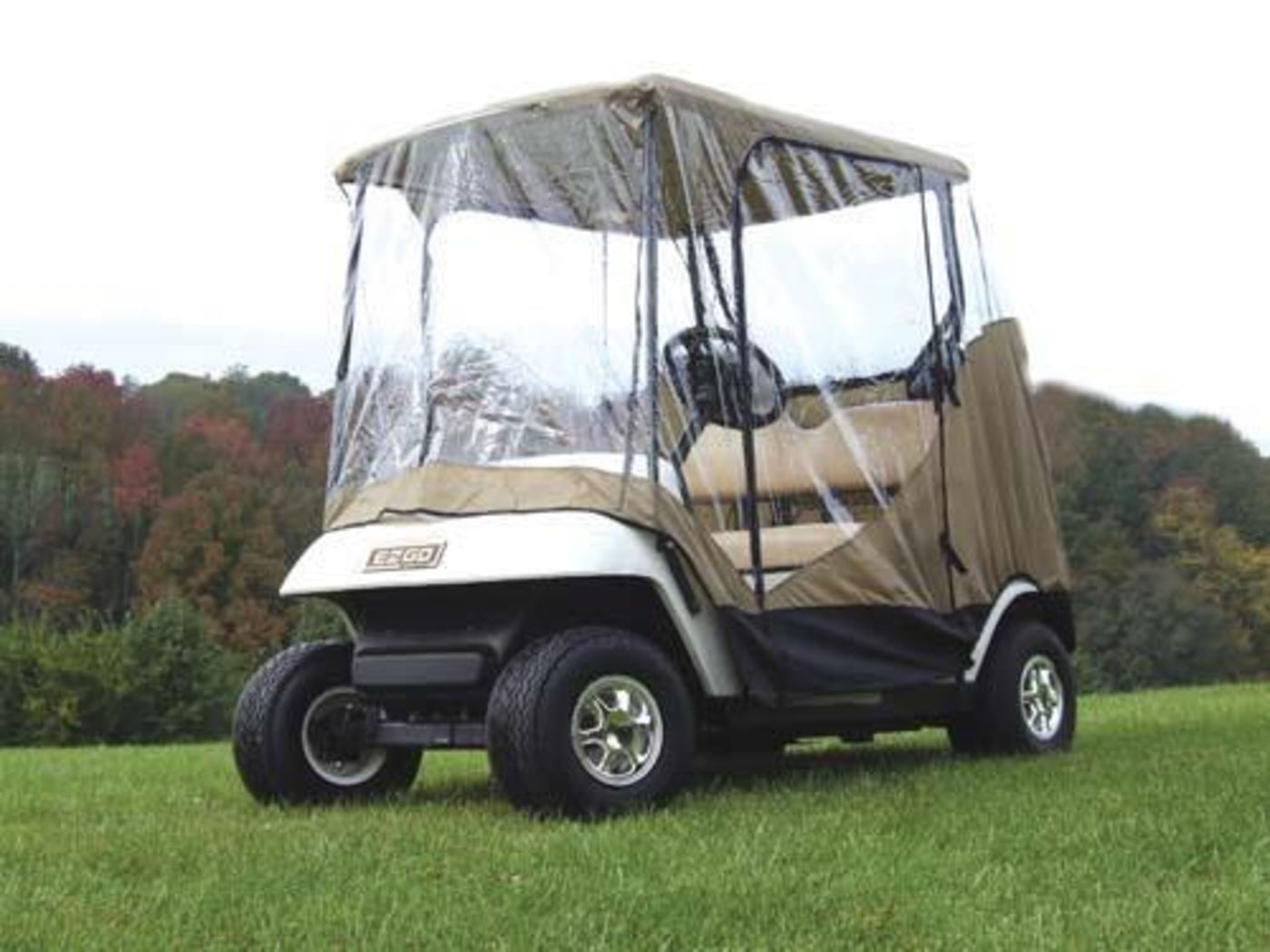 Economy enclosure, PVC/nylon with clear vinyl windows. Over the top enclosure, comes with free storage bag. Weighs only five pounds, attaches in minutes/ Zippered side opening doors can be left open.