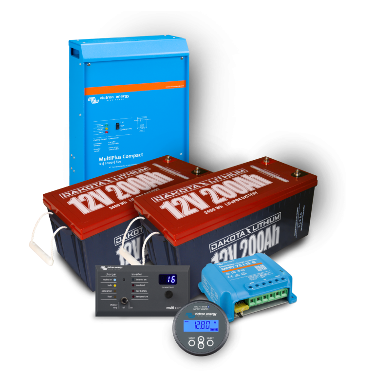 Live the dream and power your boat, RV, or cabin with Dakota Lithium batteries and Victron Energy. Add Zamp Solar panels to create your perfect sized power system. Our #1 kit for large-sized RVs, Sailboats and Yachts, School Buses, Cabins, and homes on the move. Power system includes: QTY Choose 1-3 Dakota Lithium 200Ah LiFePO4 Batteries with 11 year warranty. QTY 1 Victron Multiplus C 12/2000/80-50 120V DC to AC inverter and charger. QTY 1 Victron Energy BMV 712 Smart Battery Monitor with Bluetooth. QTY 1 Victron Energy MPPT 75/15 solar charge controller. QTY 1 Victron Digital Multi 200A GX Control Panel for Multiplus QTY 1 Dakota Lithium 12V 10A LiFePo4 battery charger. Engineered with Lithium Iron Phosphate (LiFePo4) technology your Dakota Lithium batteries have twice the power, half the weight, and lasts 4 times longer than sealed lead acid or AGM batteries - providing exceptional lifetime value. 200 Amp hours of total capacity provides a full day of power for long days on the open road in your RV. Ideal for deep cycle applications like solar energy storage, RVs, camper vans, or boating, where you need lots of power for a long time. All backed up by a best in class 11 year warranty. LiFePO4 charger included. Choose 200Ah (1 unit), 400Ah (2 units), or 600 Ah (3 units). The VICTRON MULTIPLUS C 12/2000/80-50 120V INVERTER & CHARGER is a combined inverter and charger in one elegant package. Due to its versatility, programmable settings, and rich features we have found the Multiplus to be the ultimate in off grid micro-functionality – like vans, RVs, boats, and off-grid homes. Its many features include a true sine wave inverter, adaptive charging, hybrid PowerAssist technology, plus multiple system integration features. The unique power assist allows for safe charging using generators, shore power, or other power sources and the uninterrupted energy supply (UPS) function means no downtime in the case of power disruption (it seamlessly transitions to battery power). The 2,000 watt inverter allow you to use 12V Dakota Lithium batteries to power household electronics that require 120V AC (the wall plug in your home) and is a good size to run a medium sized TV, stereo, fridge, small kitchen appliances, computers, or other home electronics. Datasheet available here. Users with larger systems can add on the Digital Multi-Control panel for easier remote access. The VICTRON ENERGY BMV 712 SMART BATTERY MONITOR WITH BLUETOOTH allows you to turn any electrical system into a smart system, with live, real time data relayed to your mobile phone or laptop via the Victron app. Want to estimate how much run time you have left for your trolling motor? Want to know if your starter battery has enough juice to get your van or RV going in the morning? Or want to estimate how much longer you can spend off grid, boondocking? The Victron BMV Smart Battery Monitor is a powerful battery monitor with Bluetooth on board for remote monitoring, and an easy to use screen for manual data. Instruction manual available here. The VICTRON SMARTSOLAR MPPT 75/15 SOLAR CHARGE CONTROLLER is recommended for charging batteries with solar energy. When using solar on your boat, yacht, van or RV you will need a charging device which converts the energy which your panels are producing to a stable charging voltage and current that your batteries can easily accept. A solar controller will increase the efficiency of your panels, increasing the amount of energy available for your use. The Smart Solar series from Victron also includes Bluetooth smart monitoring, or with the GX series of monitoring equipment, a user can set charging parameter and battery type (choose the lithium setting for DL battereies), and monitor and record solar yields. We’re a fan of this charge controller because of it’s professional grade performance and the easy to use bluetooth phone app. Datasheet available here. A solar charge controller is recommended for any solar energy system with 100 watts of solar panels or more. This charge controller supports up to 200 watts of solar panels. If adding more than 200 watts of solar add additional charge controllers or install a controller rated at a higher amp rating. The VICTRON DIGITAL MULTI CONTROL 200/200A CONTROL PANEL FOR MULTIPLUS is used to remotely view and adjust AC input currents, and turn on and off the Multiplus. It is designed to integrate cleanly with your boat, vehicle or house system control panel. This is a recommended add on for the Multiplus, since it allows you to install the Multiplus out of sight, and use this control panel to manage the settings of your Multiplus inverter and charger. Think of this as the easy to use dashboard for your system. SOLAR POWER ADD-ON. If desired you can add-on Zamp Solar rooftop kits. The 170 watt Zamp Solar rooftop kit offers enough power to charge one DL 200Ah battery. Add up to two 170 watt Zamp solar extension packs for a total of 510 watts of solar - enough to power 600Ah of batteries. CHARGE VIA YOUR ENGINE'S ALTERNATOR ADD ON. If you are planning to charge your batteries via your engine's alternator we recommend adding a VICTRON ORION-TR SMART 12/12-18A ISOLATED DC-DC CHARGER. This will ensure your engine's alternator charges the battery at the lithium preferred voltage.
