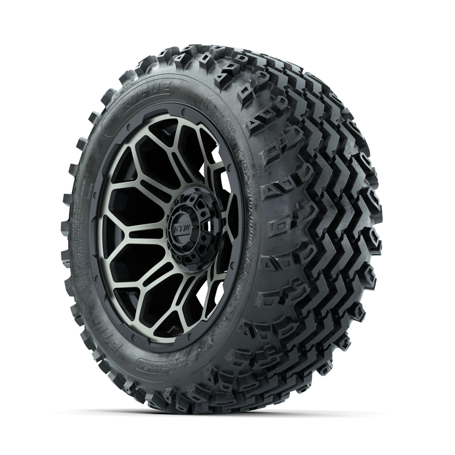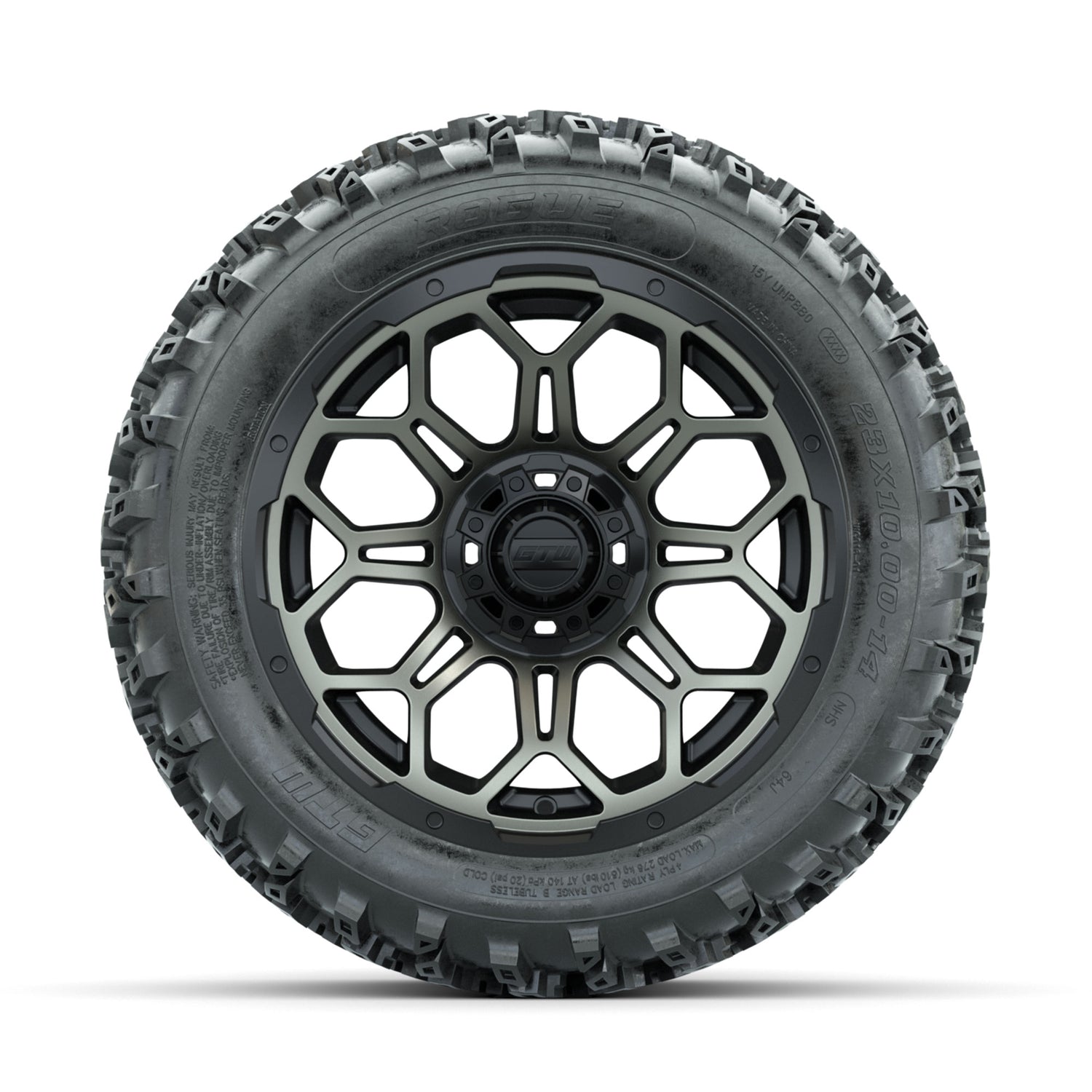 A set of (4) 14-inch GTW® Bravo Bronze/Black golf cart wheels Mounted on 23x10.00-14 Rogue All-Terrain Tires