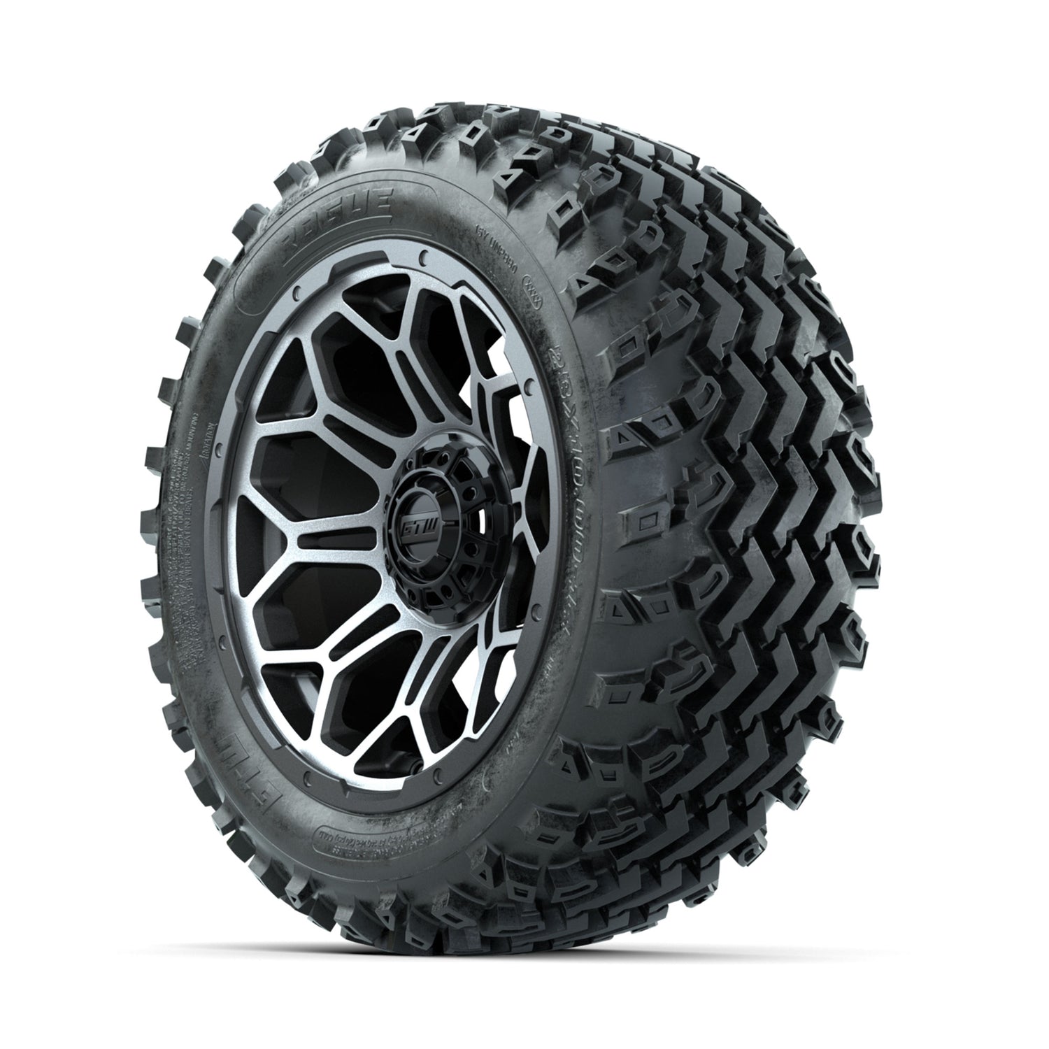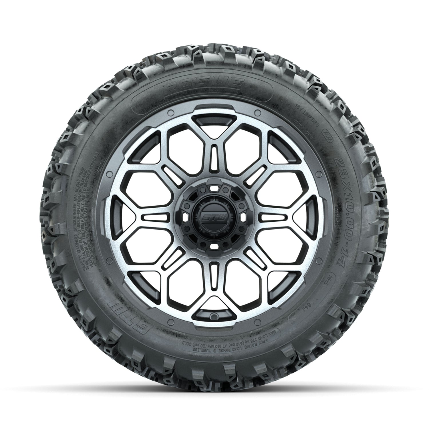 A set of (4) 14-inch GTW® Bravo Machined/Matte Grey golf cart wheels Mounted on 23x10.00-14 Rogue All-Terrain Tires