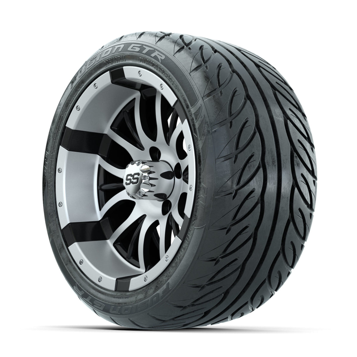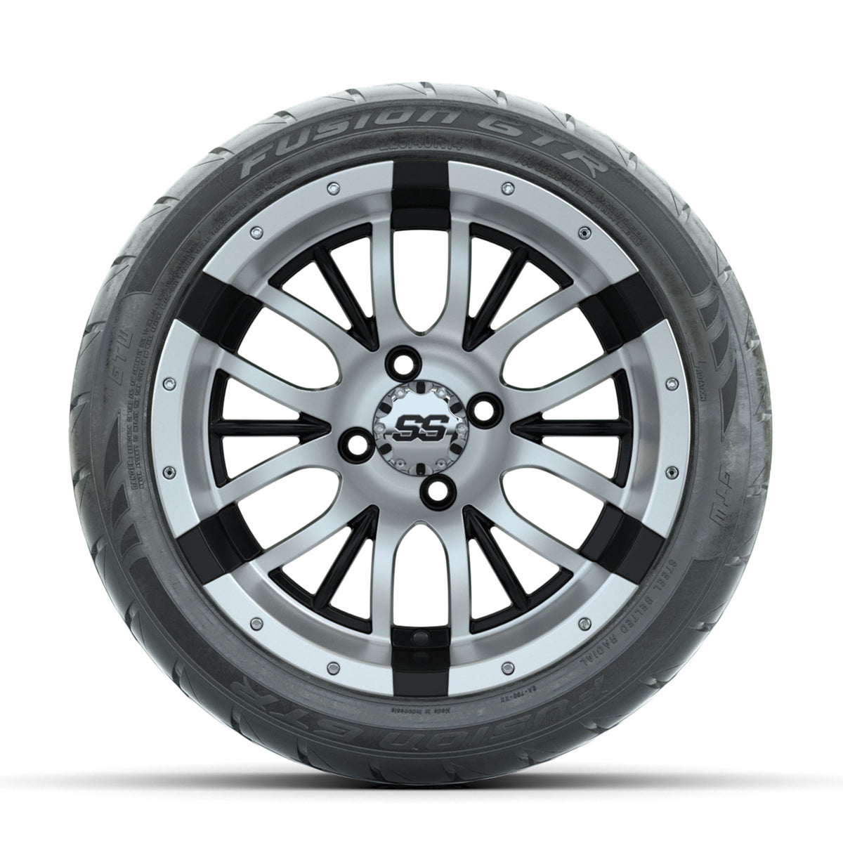 A set of (4) 14-inch GTW® Diesel Machined/Black golf cart wheels Mounted on 225/40-R14 GTW® Fusion GTR Steel Belted Street Tires