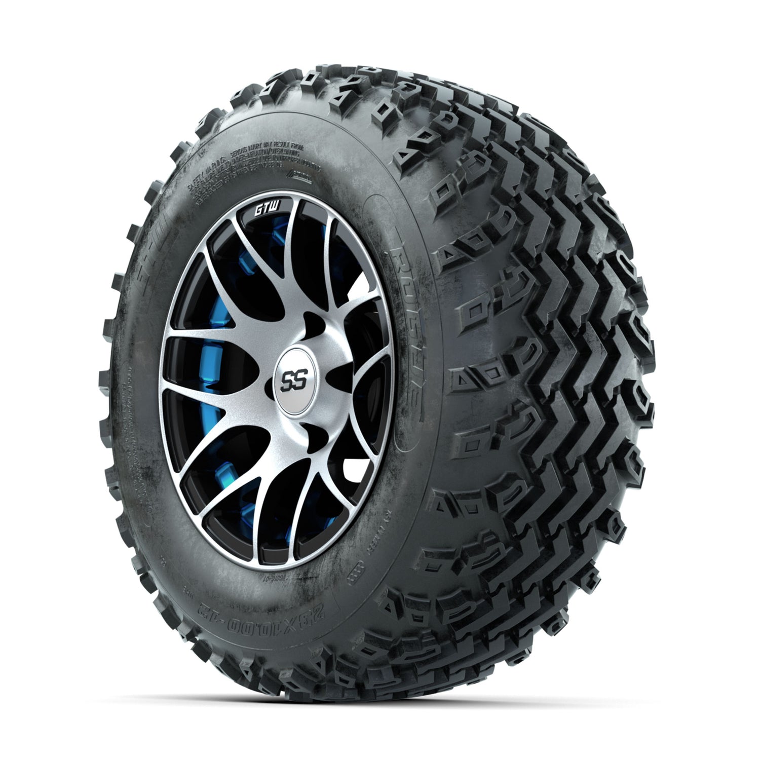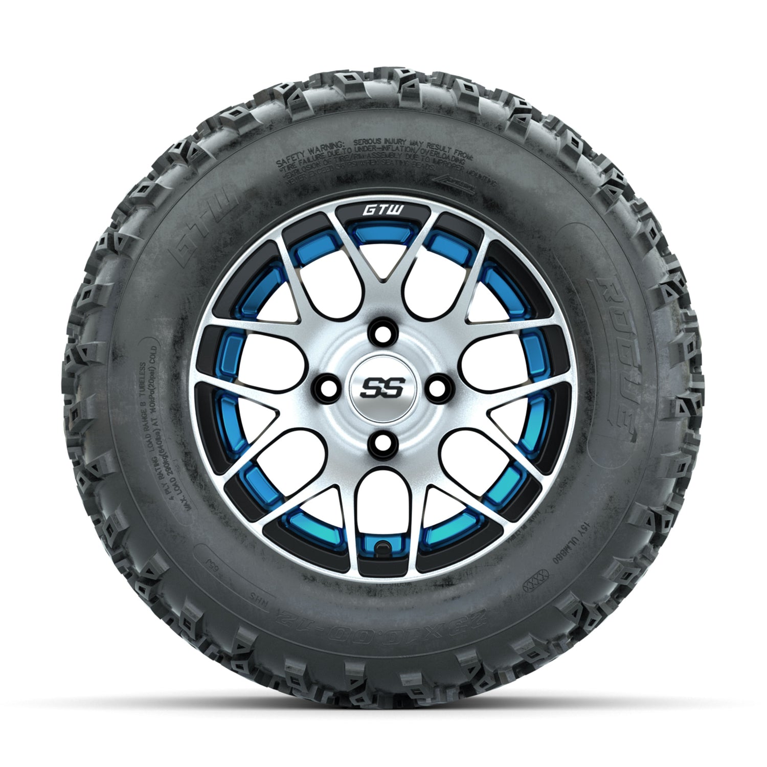 A set of (4) 12-inch GTW® Pursuit Blue golf cart wheels Mounted on 23x10.00-12 Rogue All-Terrain Tires
