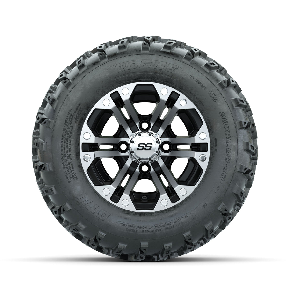 A set of (4) 10-inch GTW® Specter Machined/Black golf cart wheels Mounted on 20x10.00-10 Rogue All-Terrain Tires