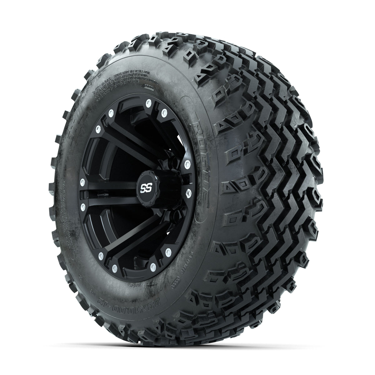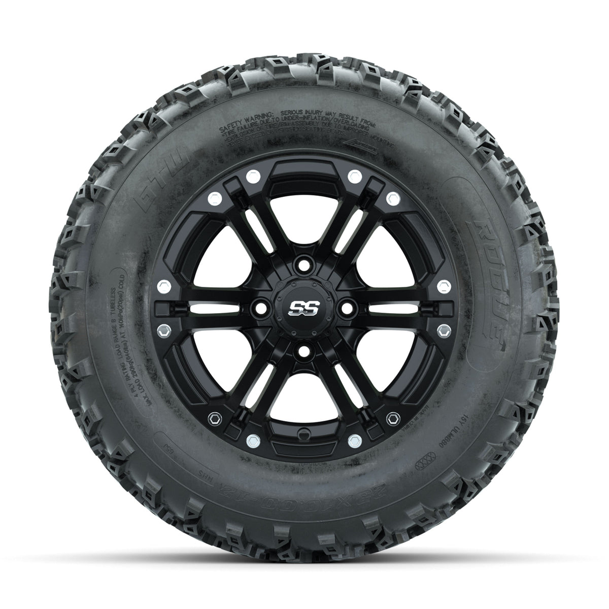 A set of (4) 12-inch GTW® Specter Matte Black golf cart wheels Mounted on 23x10.00-12 Rogue All-Terrain Tires