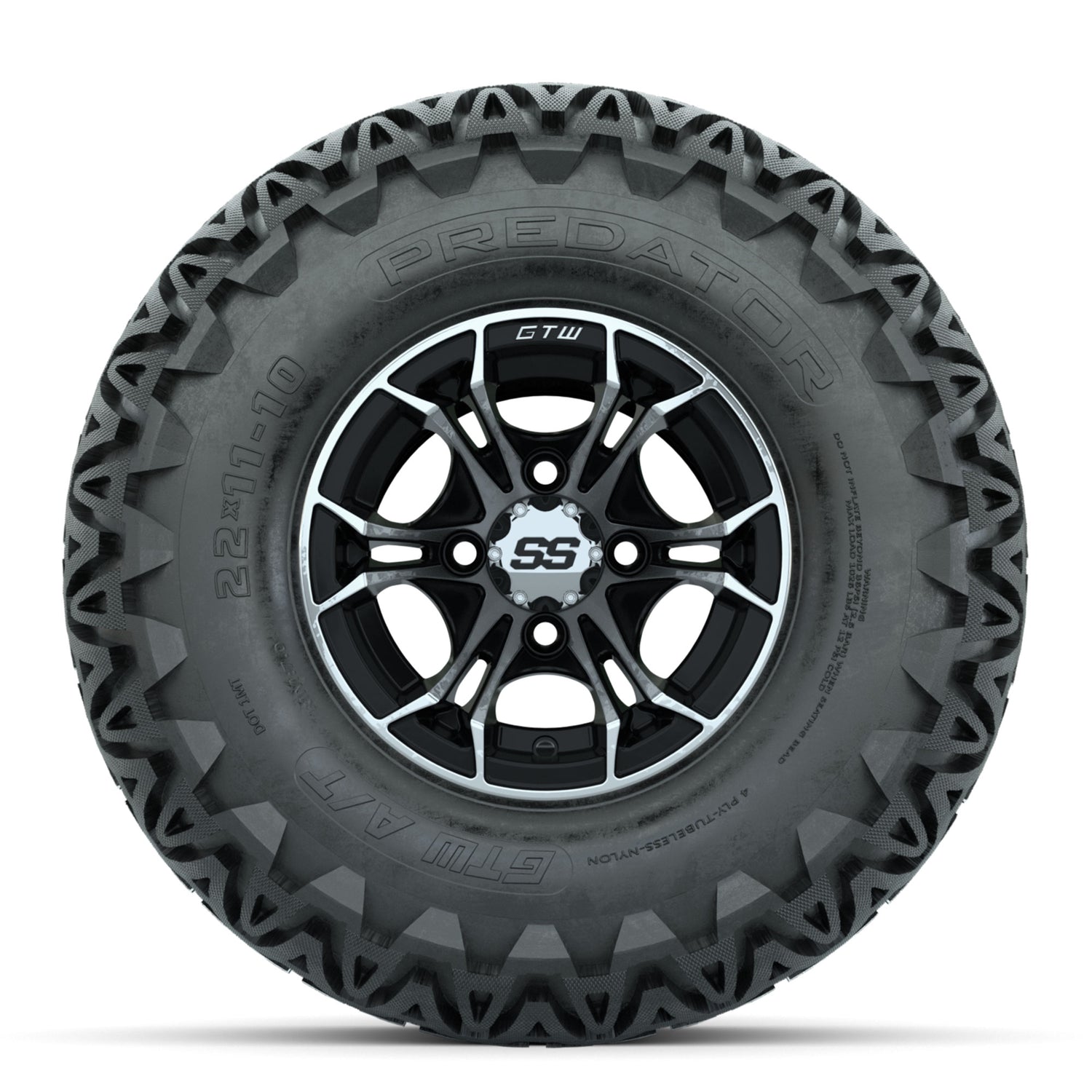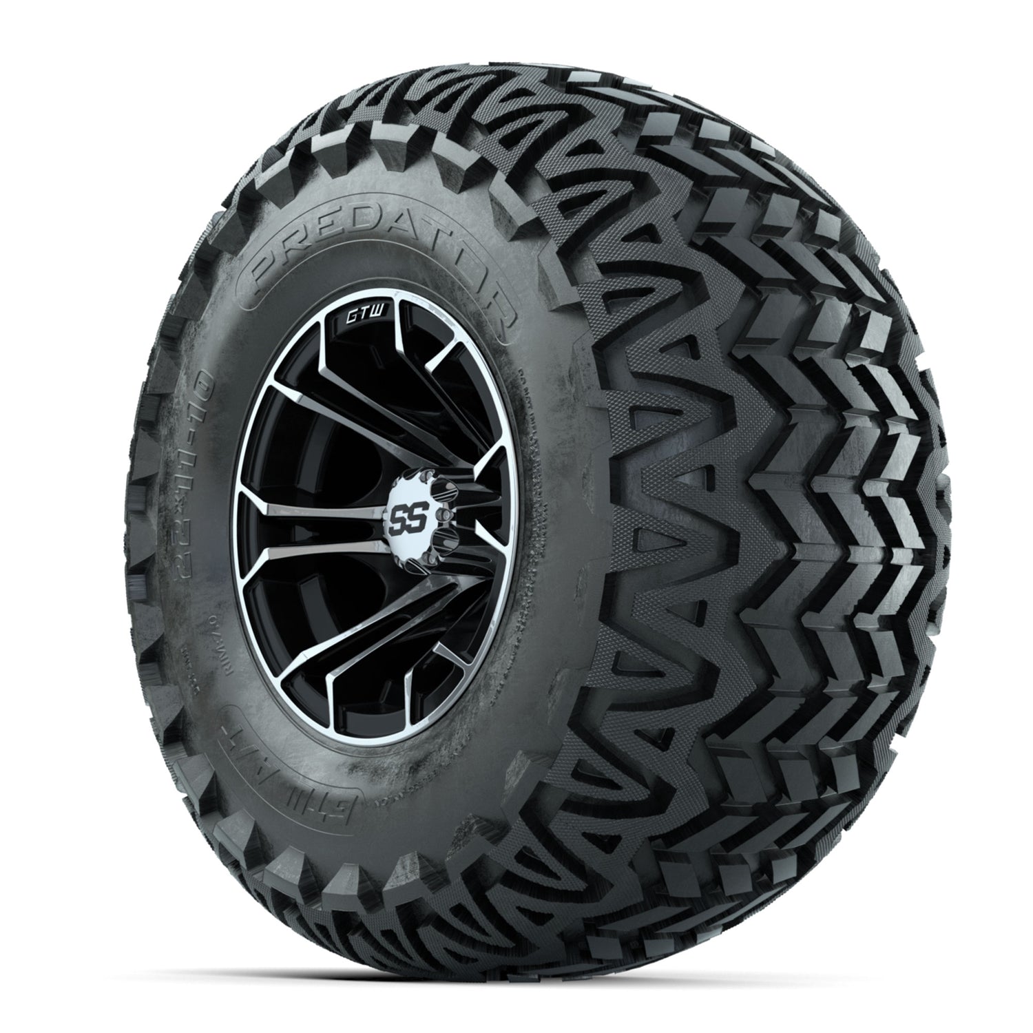 A set of (4) 10-inch GTW® Spyder Machined/Black golf cart wheels Mounted on 22x11-10 GTW Predator All-Terrain Tires