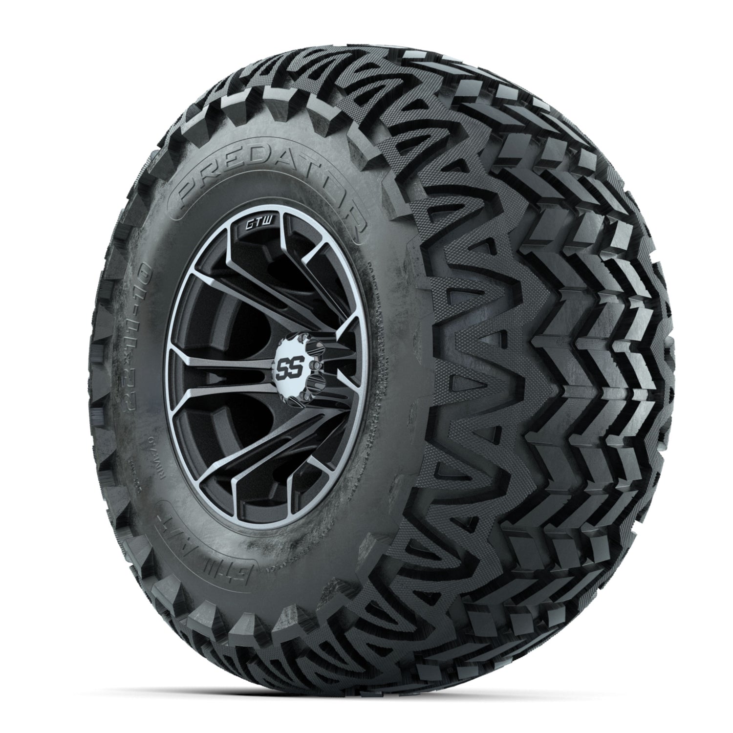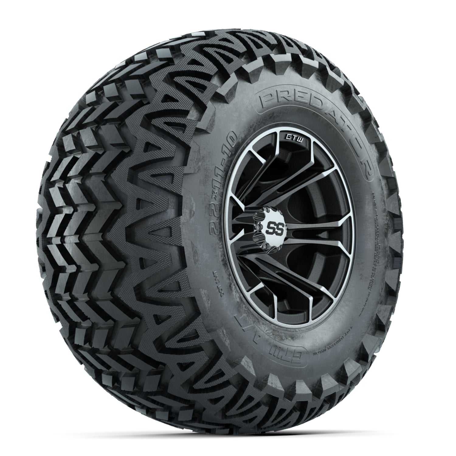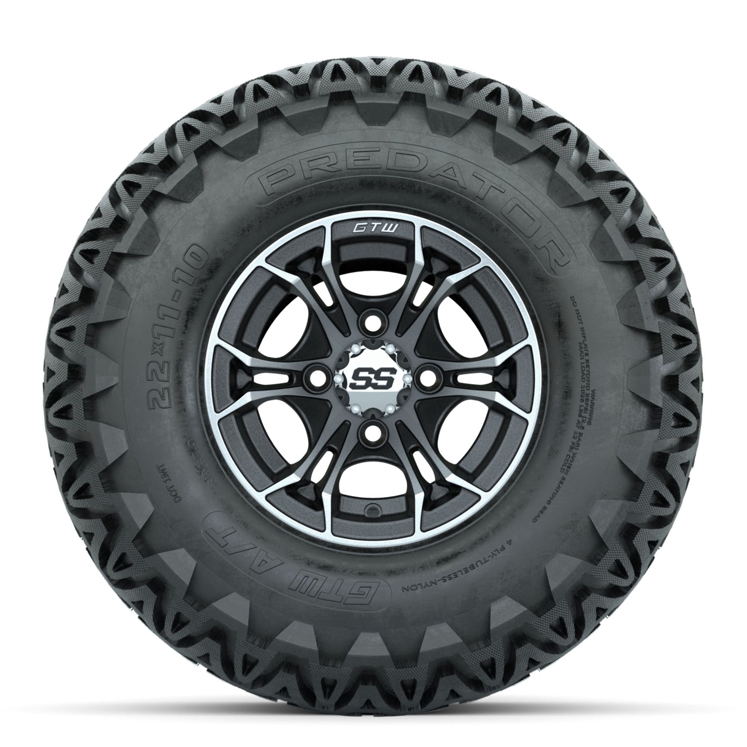 A set of (4) 10-inch GTW® Spyder Machined/Matte Grey golf cart wheels Mounted on 22x11-10 GTW Predator All-Terrain Tires