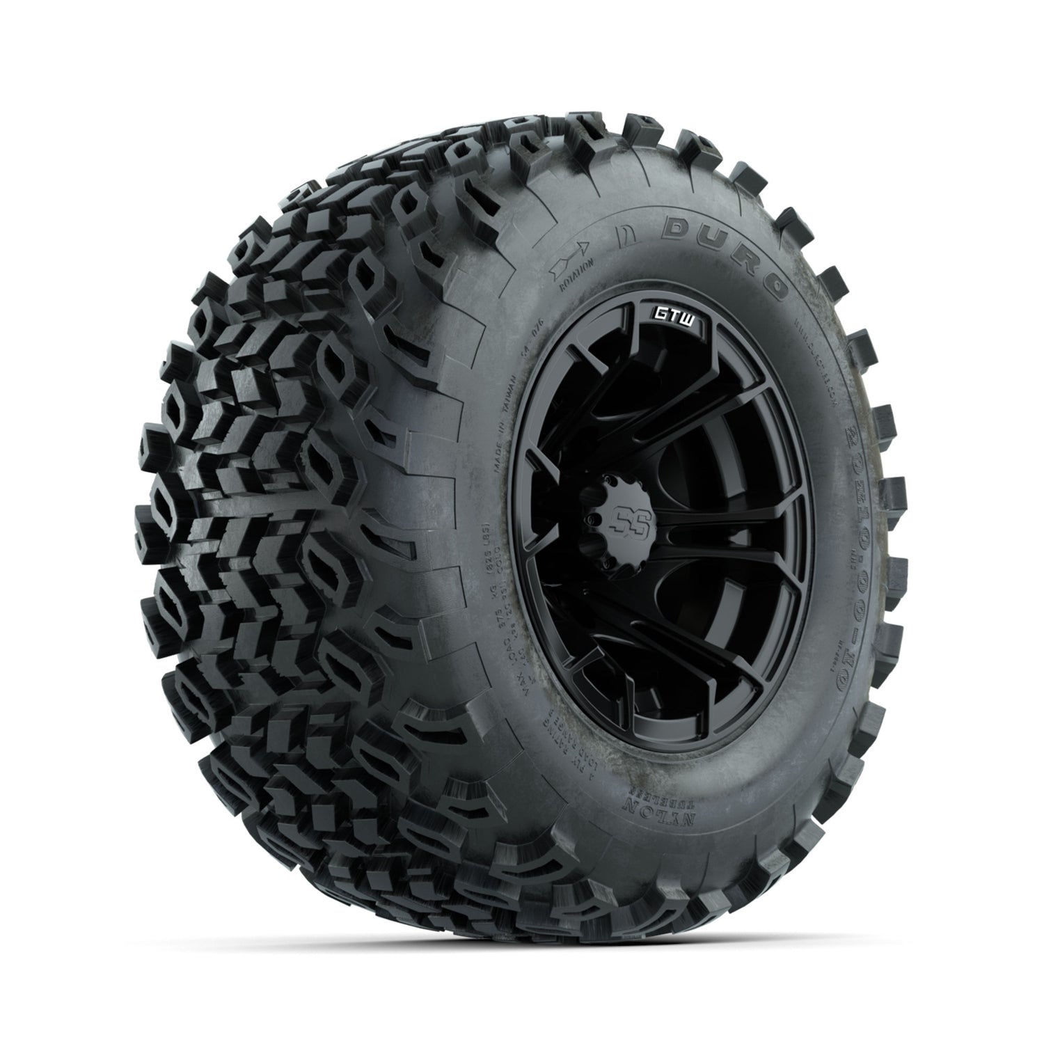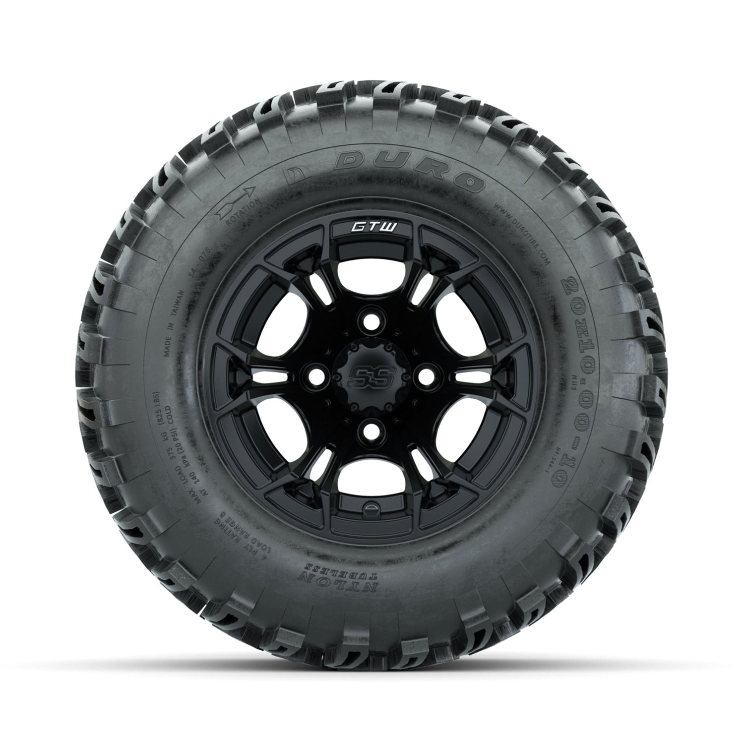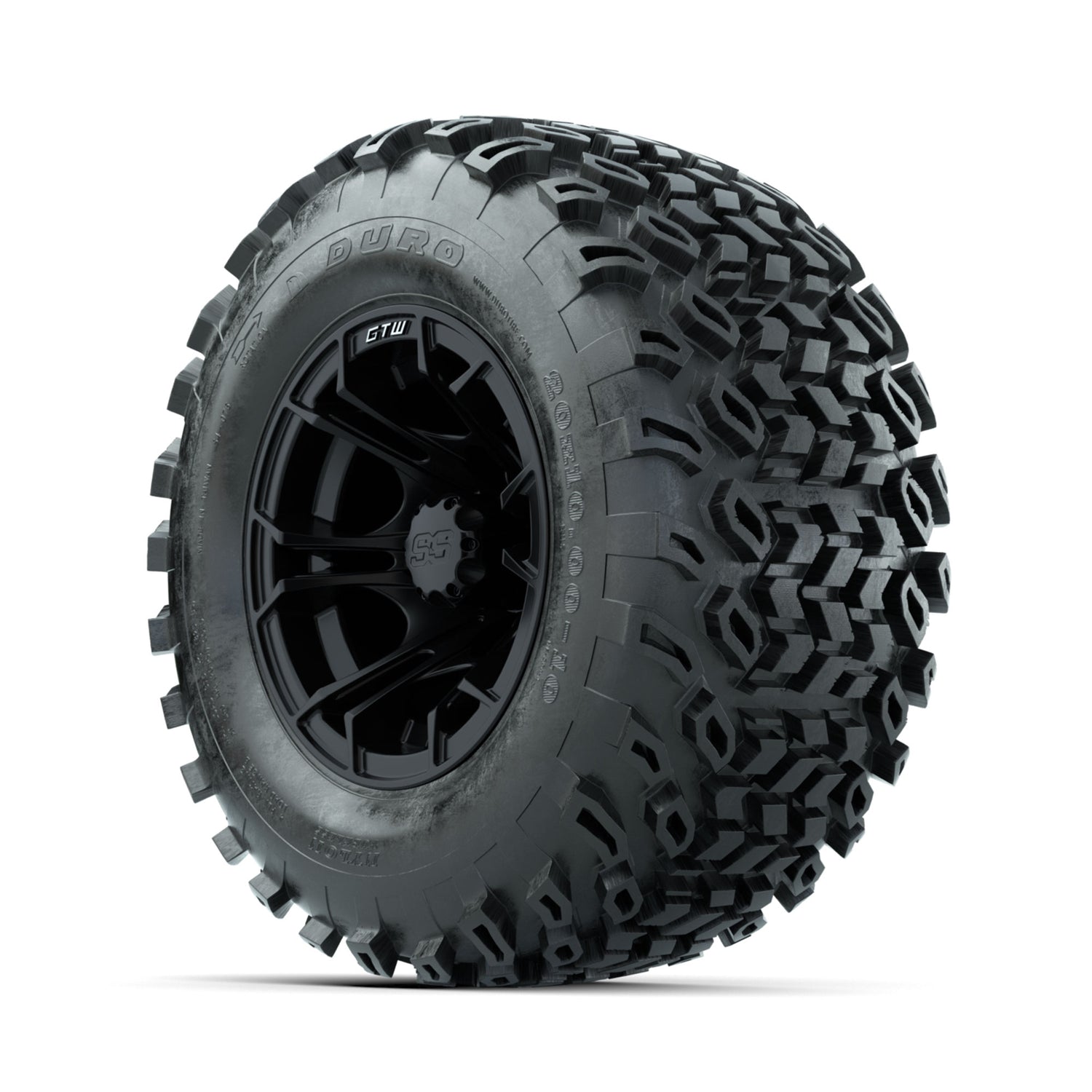 A set of (4) 10-inch GTW® Spyder Matte Black golf cart wheels Mounted on 20x10-10 Duro Desert All Terrain Tires