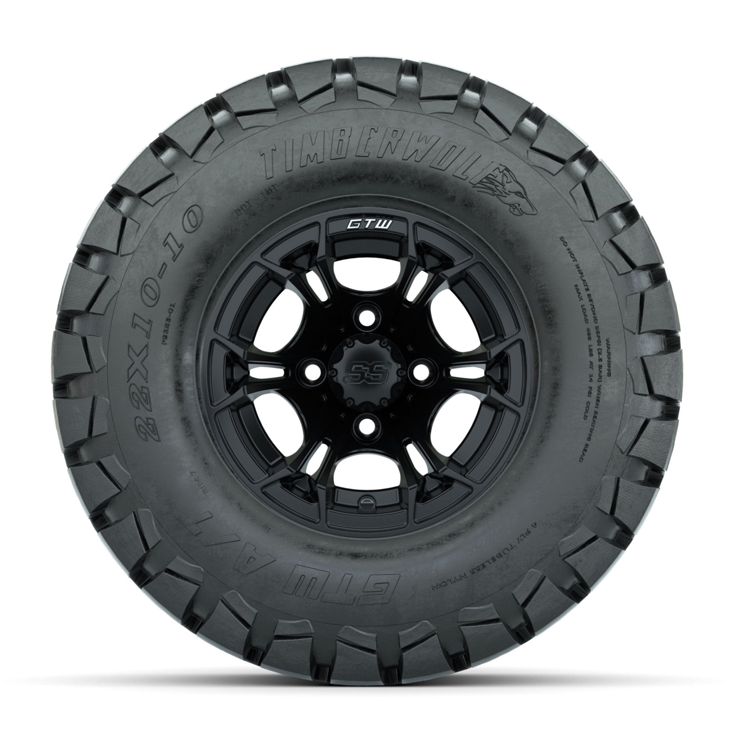 A set of (4) 10-inch GTW® Spyder Matte Black golf cart wheels Mounted on 22x10-10 GTW Timberwolf All-Terrain Tires