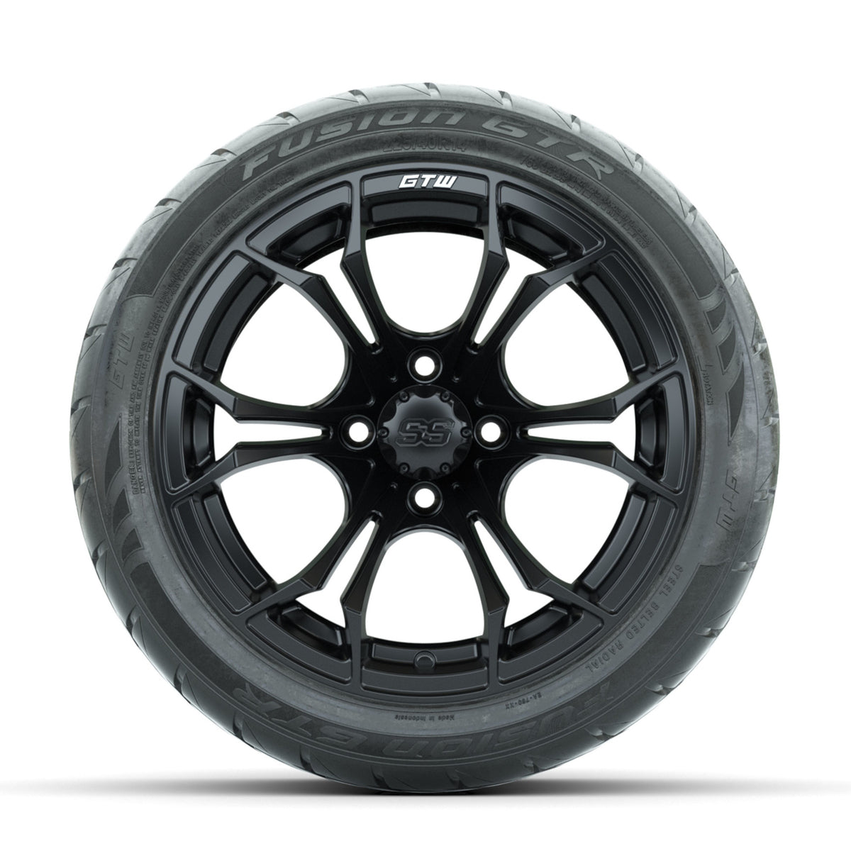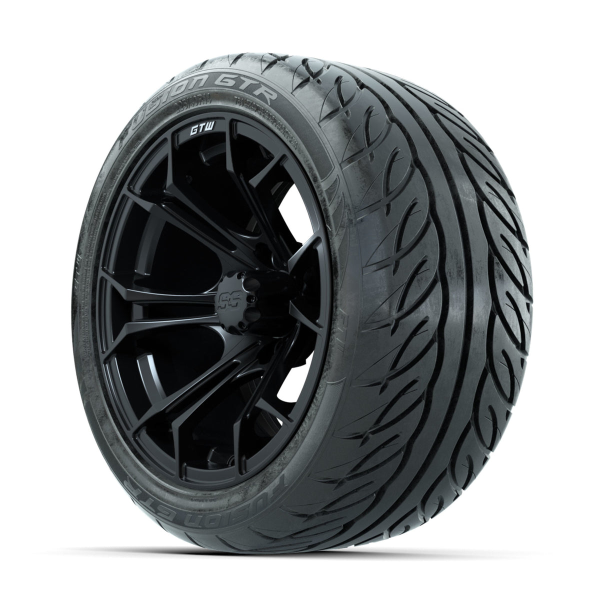 A set of (4) 14-inch GTW® Spyder Matte Black golf cart wheels Mounted on 225/40-R14 GTW® Fusion GTR Steel Belted Street Tires