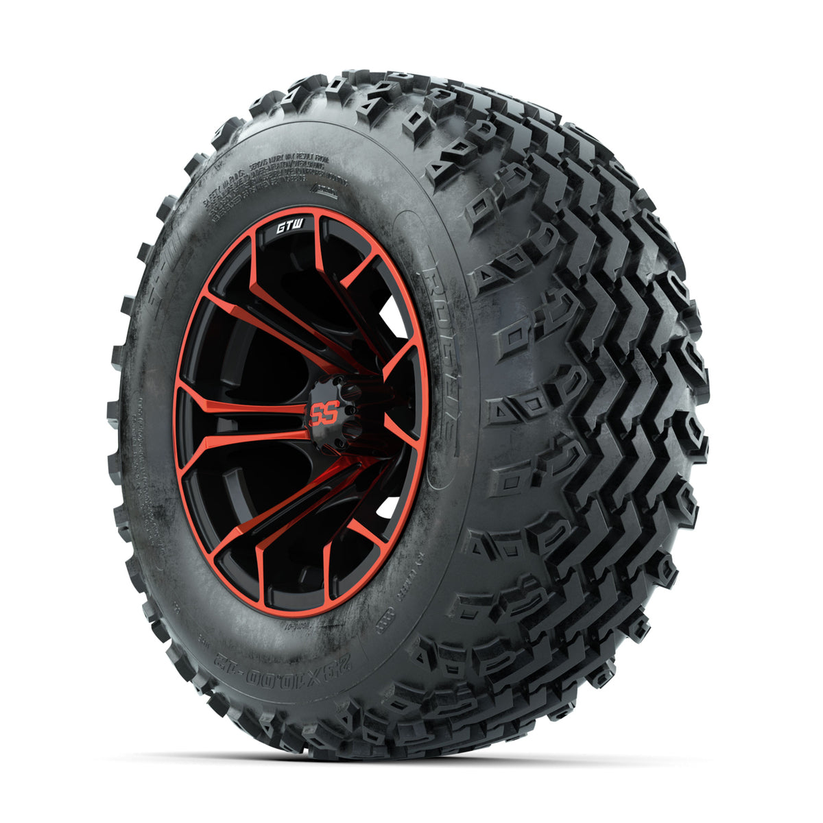 A set of (4) 12-inch GTW® Spyder Red/Black golf cart wheels Mounted on 23x10.00-12 Rogue All-Terrain Tires