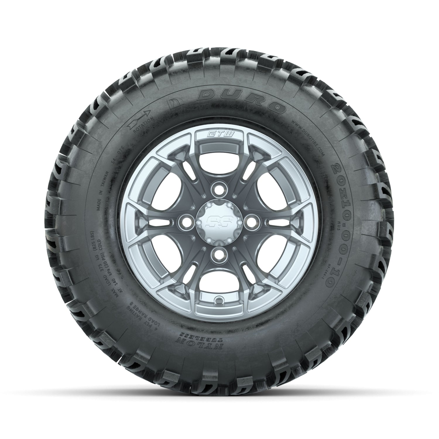 A set of (4) 10-inch GTW® Spyder Silver Brush golf cart wheels Mounted on 20x10-10 Duro Desert All Terrain Tires