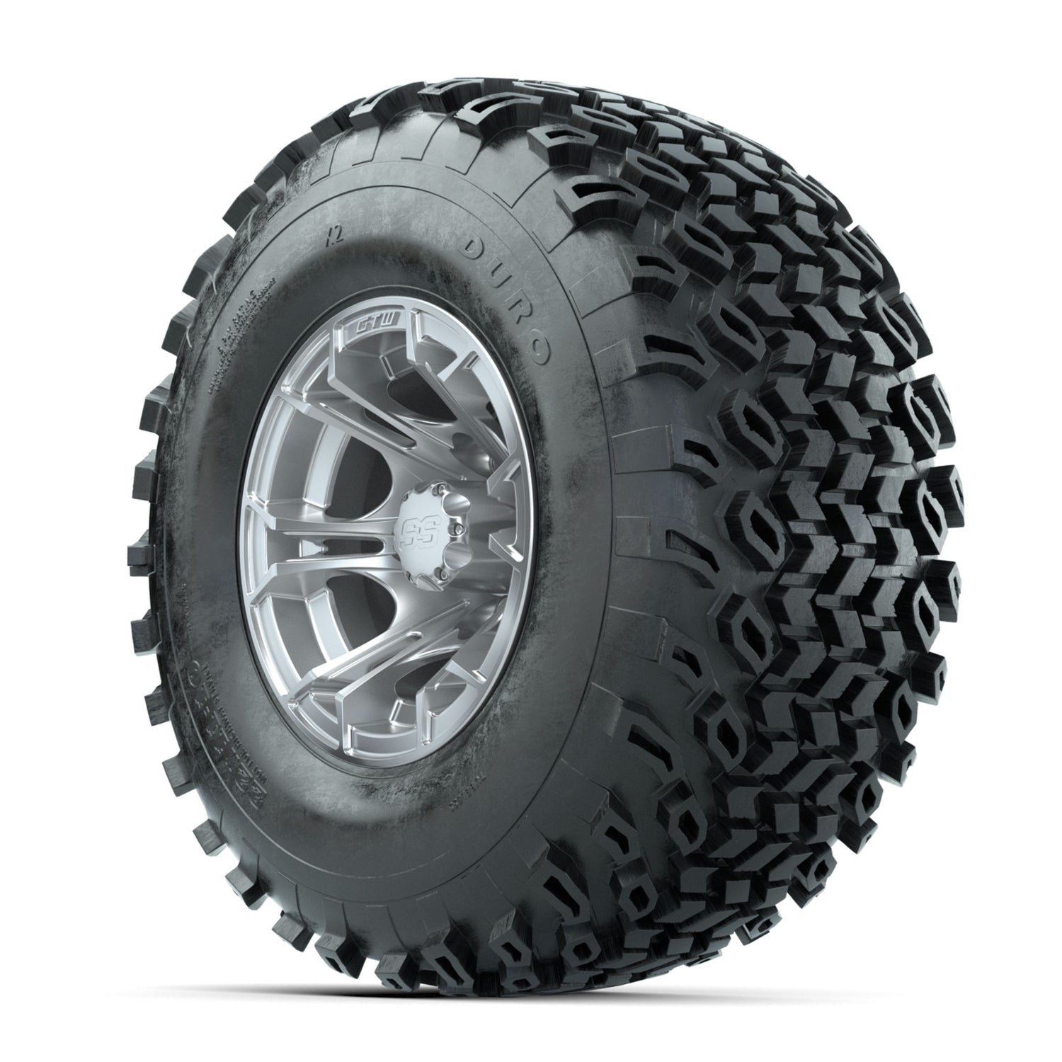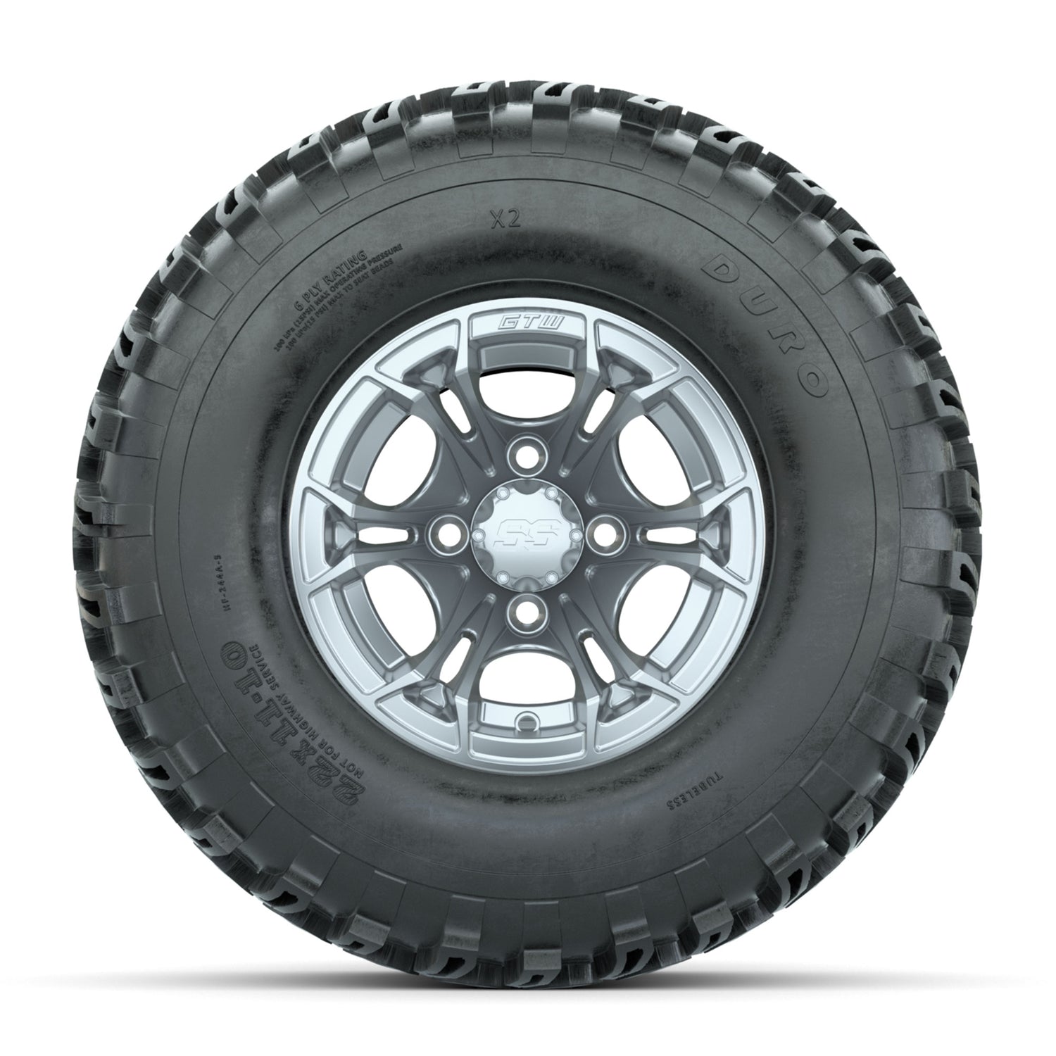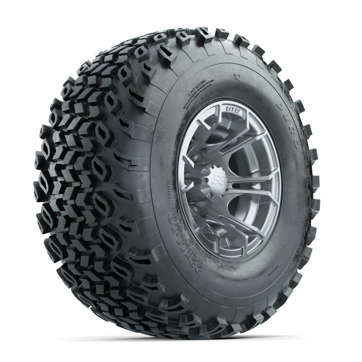 A set of (4) 10-inch GTW® Spyder Silver Brush golf cart wheels Mounted on 22x11-10 GTW Duro Desert All-Terrain Tires