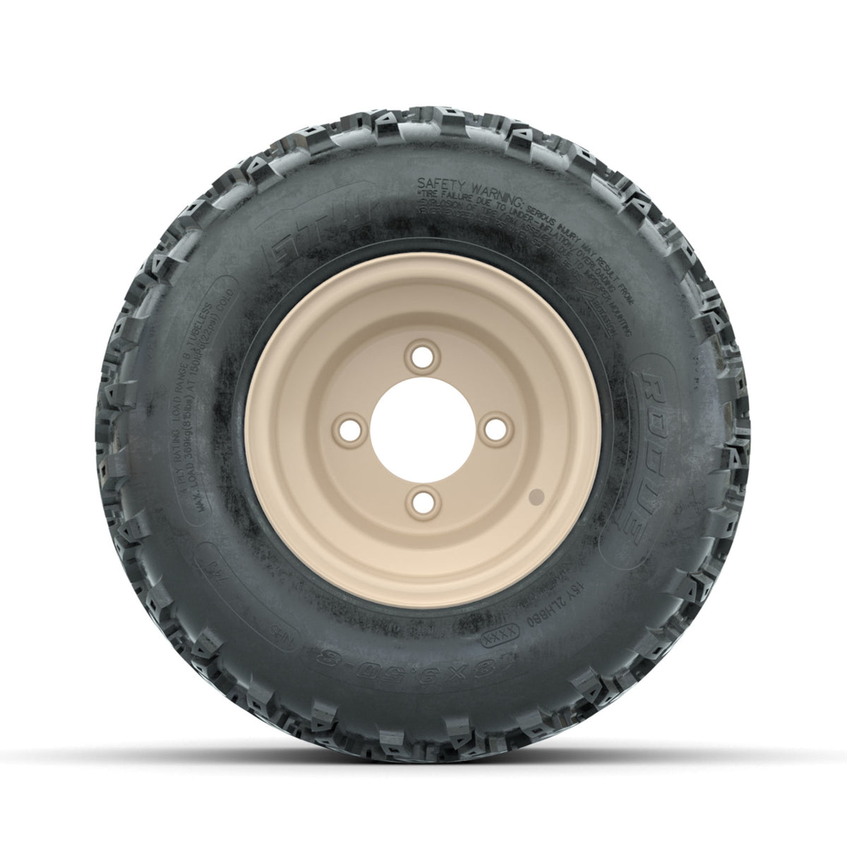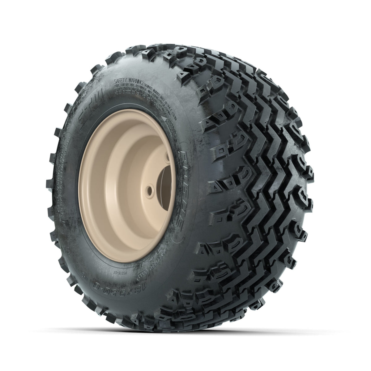 A set of (4) 8-inch GTW® Steel Club Car Beige Centered golf cart wheels Mounted on 18x9.50-8 Rogue All-Terrain Tires