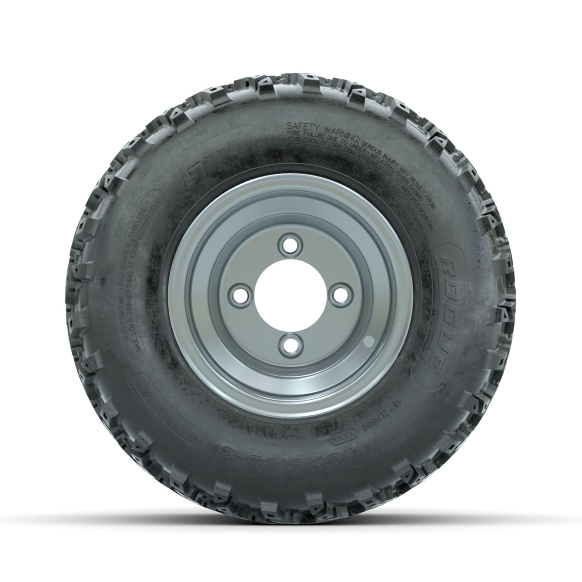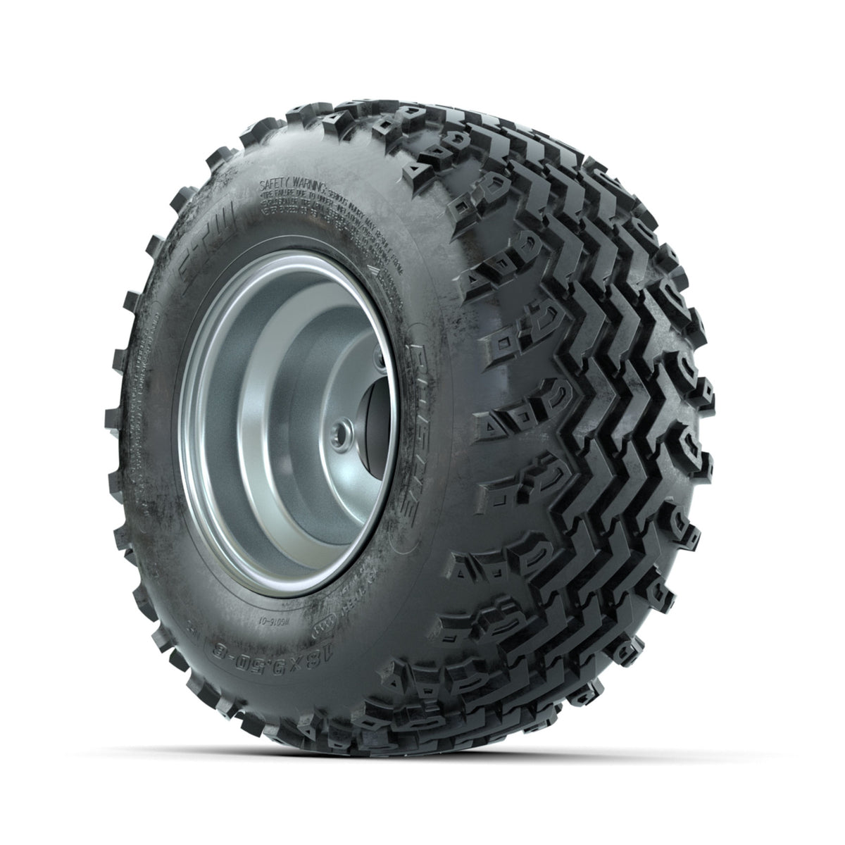 A set of (4) 8-inch GTW® Steel Silver Centered golf cart wheels Mounted on 18x9.50-8 Rogue All-Terrain Tires