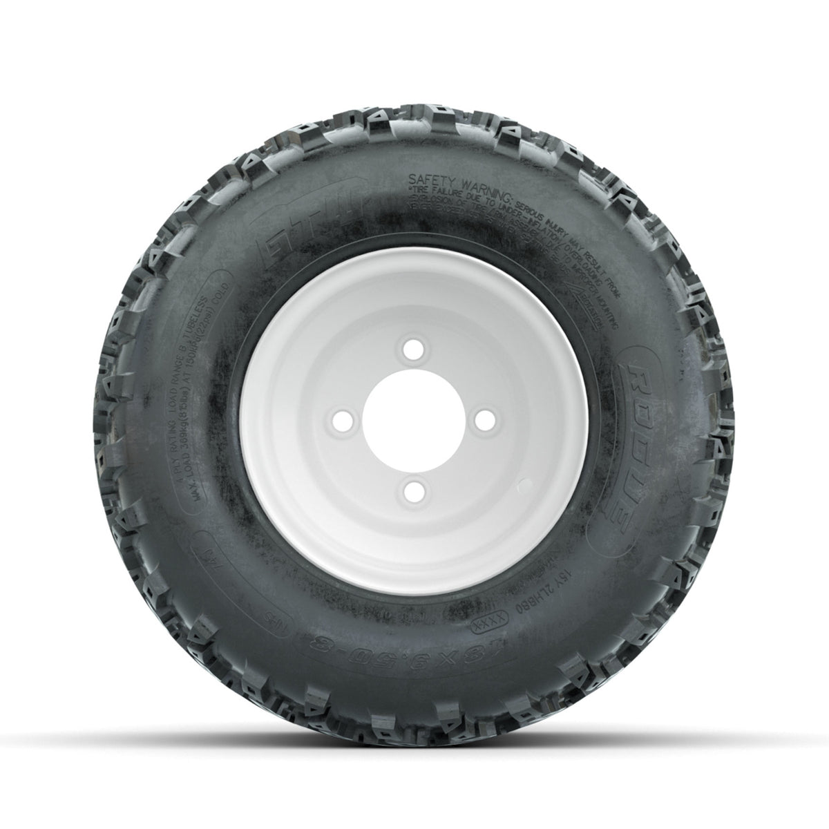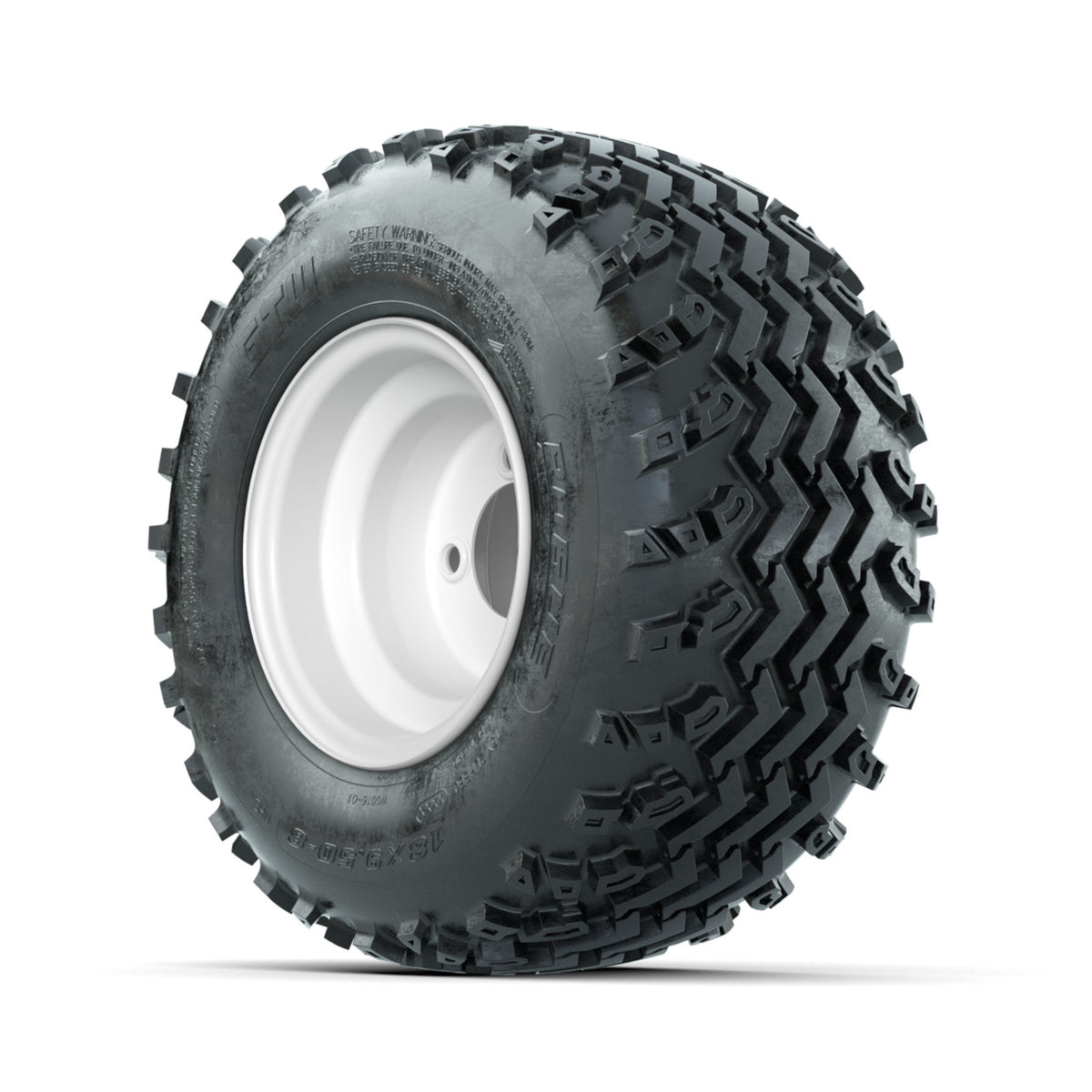 A set of (4) 8-inch GTW® Steel White Centered golf cart wheels Mounted on 18x9.50-8 Rogue All-Terrain Tires