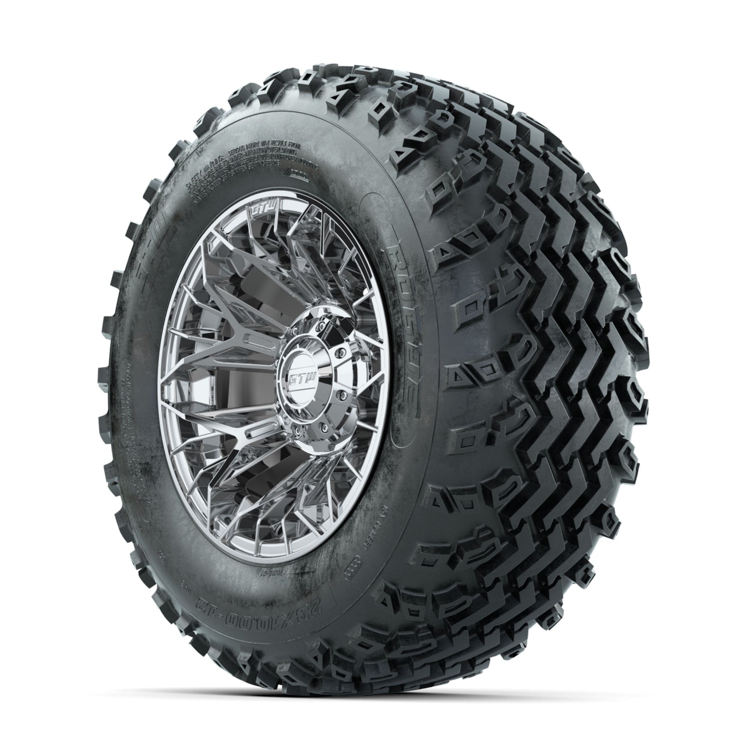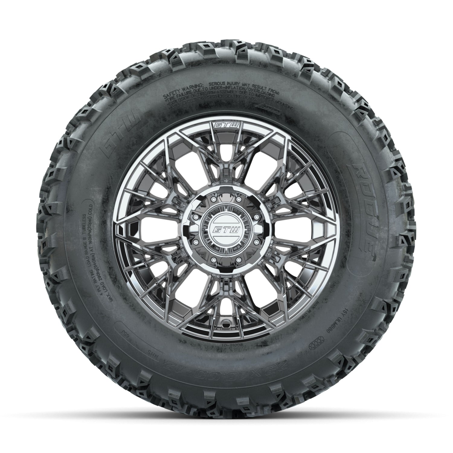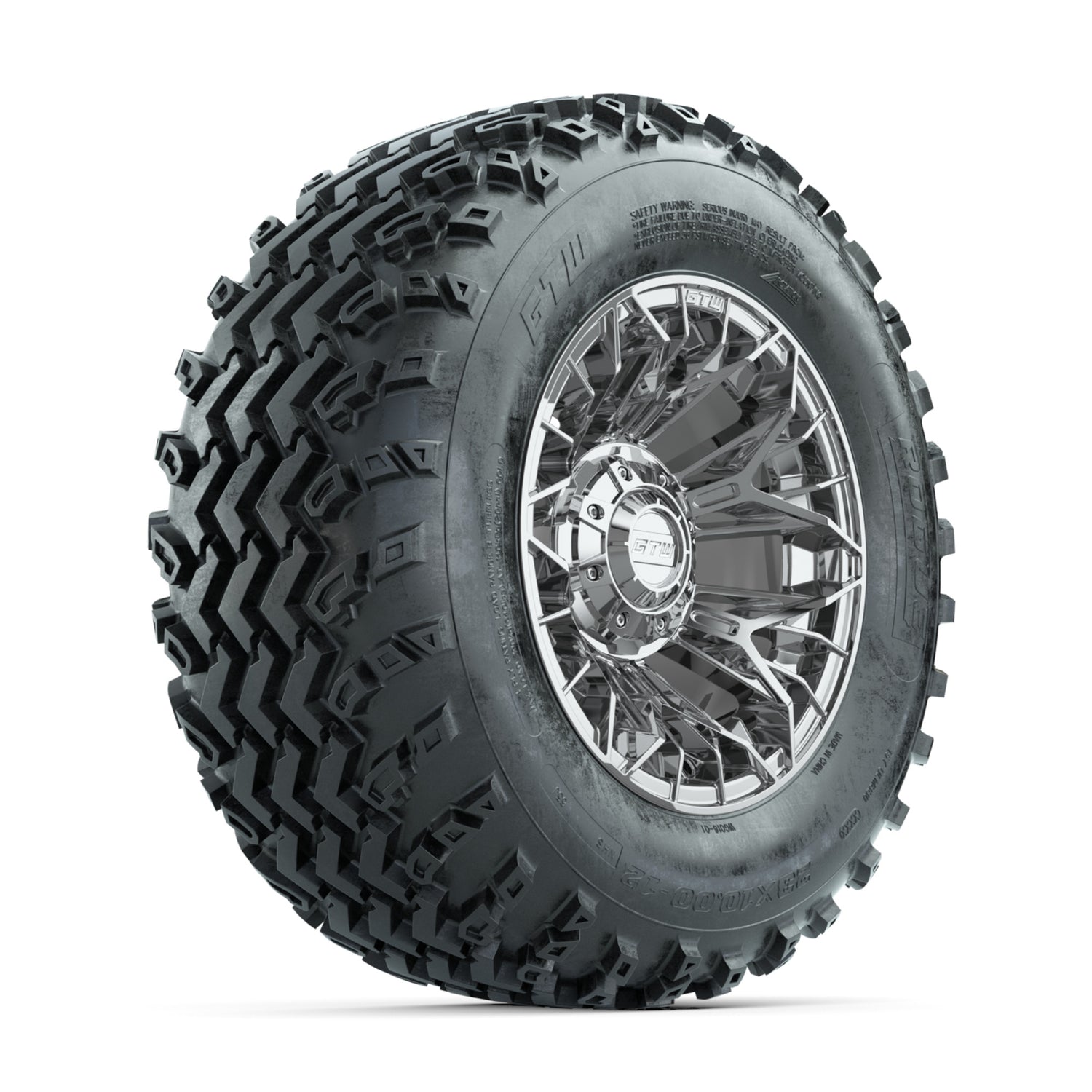 A set of (4) 12-inch GTW® Stellar Chrome golf cart wheels Mounted on 23x10.00-12 Rogue All-Terrain Tires