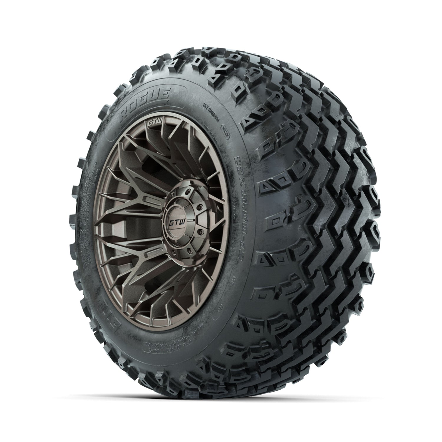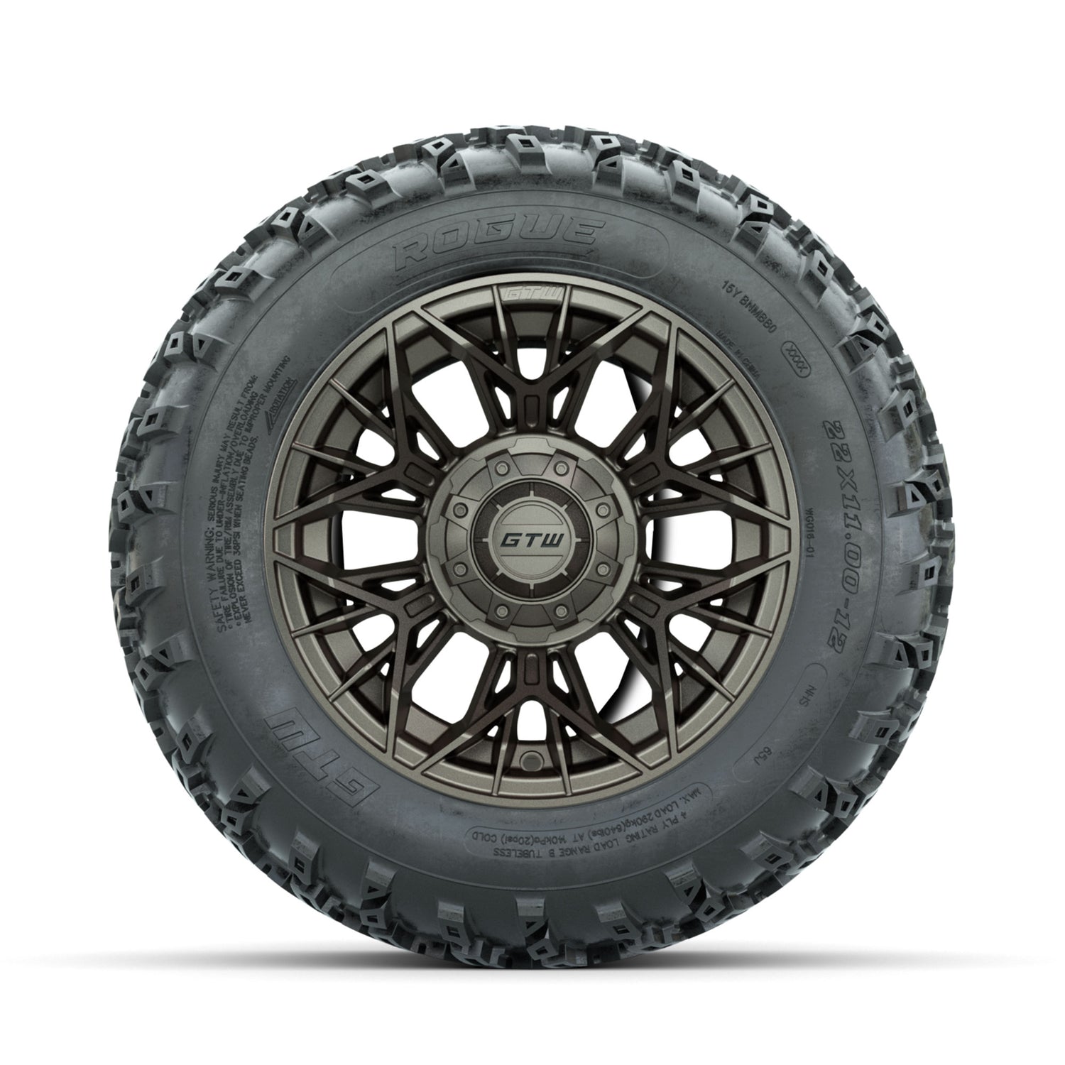 A set of (4) 12-inch GTW® Stellar Matte Bronze golf cart wheels Mounted on 22x11.00-12 Rogue All-Terrain Tires